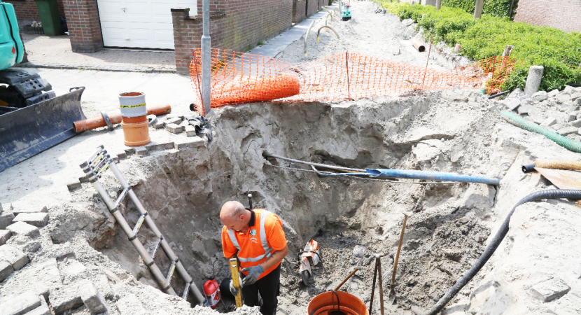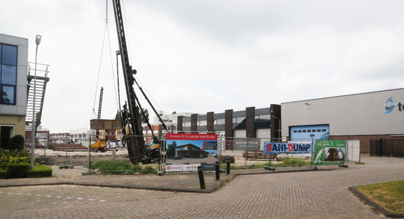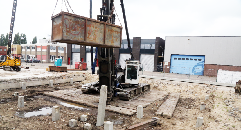 Zodra het heien van de betonnen palen is afgerond wordt gestart met de funderingswerk-zaamheden en het opmetselen van de muren van het bedrijfsverzamelgebouw.