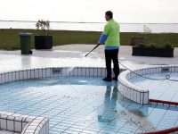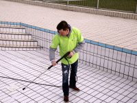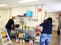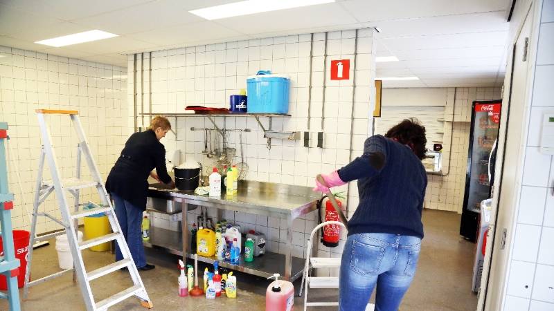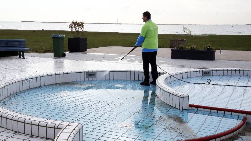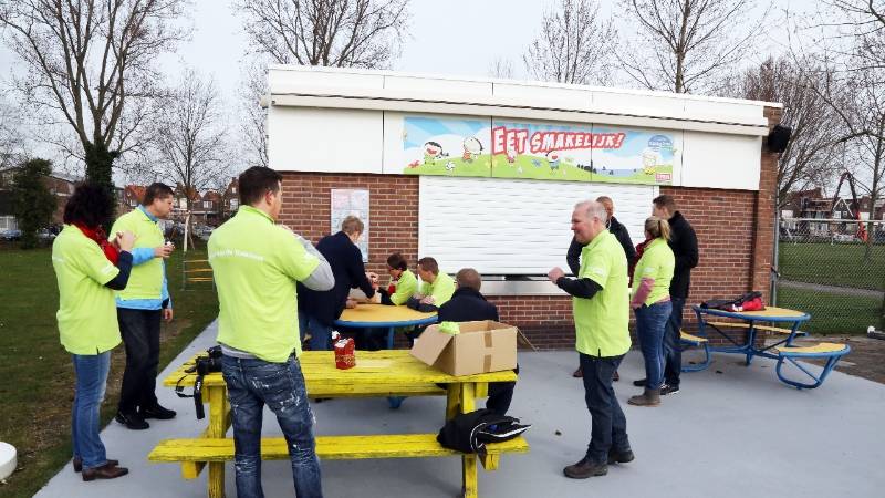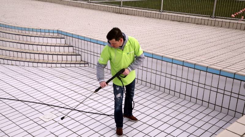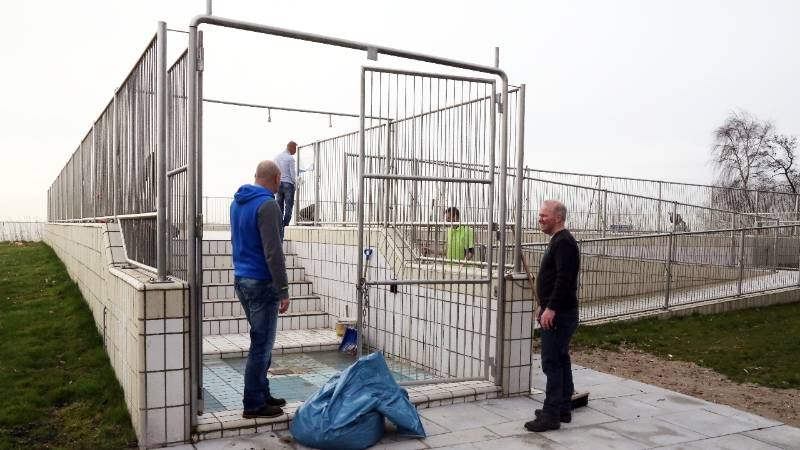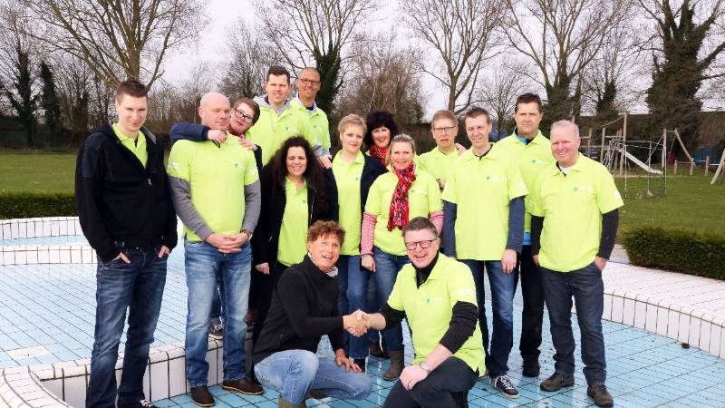 Bankmensen die op het kantoor in Volendam en Purmerend werkzaam zijn waren aan het schrobben, poetsen en spuiten met een hogedruk om de zwembaden en speelattributen en de kiosk en keuken weer blinkend schoon te maken.