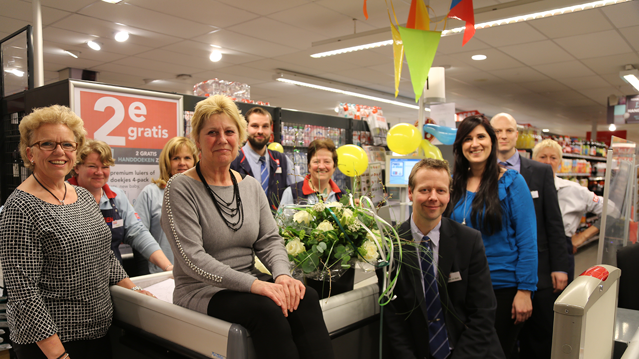 Sinds 2000 is zij werkzaam in Deen Havenhof als assistent hoofd caissière. Agnes werd maandag verrast door haar collega’s en de directie van Deen Supermarkten met lieve woorden, kado’s en bloemen.
