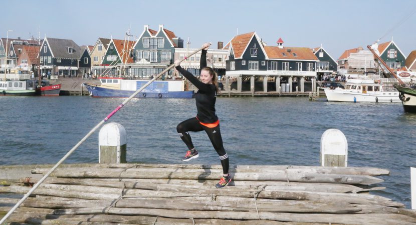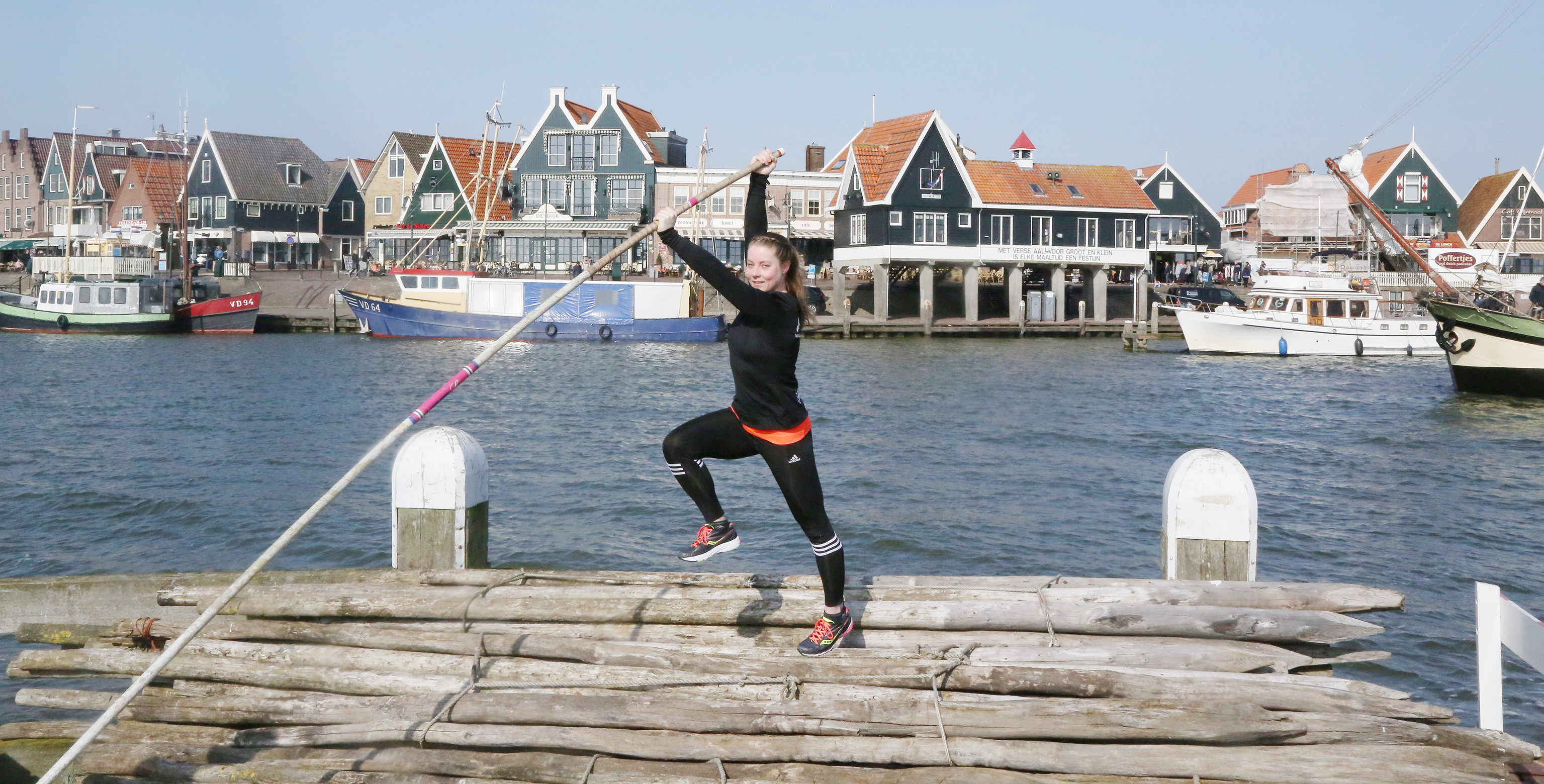 ,,Maar als je goed naar foto’s kijkt, heb ik nog een stuk ruimte van de stok over, om ’m bij de aanloop hoger te pakken. Ik spring nu dus over 4.10 meter heen. Theoretisch gezien, als ik ’m helemaal bovenaan zou vastpakken, moet ik ook een stuk hoger kunnen springen. Maar omdat we en aantal dingen – zoals aanloopsnelheid – hebben omgegooid, kan ik mentaal nog niet die stap maken om de stok bovenaan te pakken. Daar werk ik op deze trainingsstage (ze vertoeft momenteel twee weken in Portugal, red.) aan werken. Ik heb nu een twaalf-pas aanloop en dat is eigenlijk te kort. Bij een 14- of 16-pas aanloop maak je veel meer snelheid. Waardoor je ook zwaardere stokken kunt pakken. Des te zwaarder de stokken, des te meer buigzaamheid krijg je en des te meer je omhoog wordt geschoten. Als je aanloop te kort is, krijg je dat soort stokken niet op tijd in een kromming.”