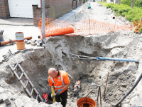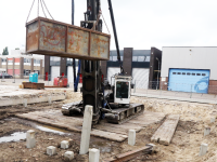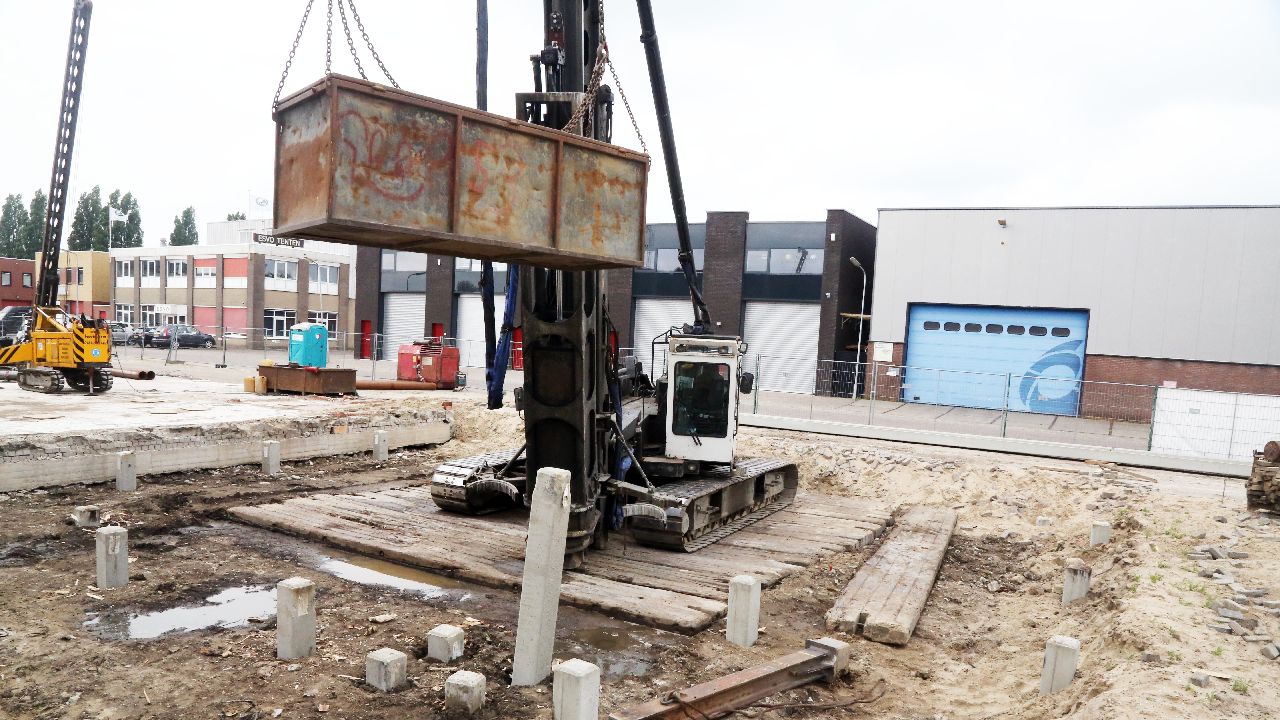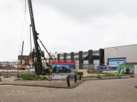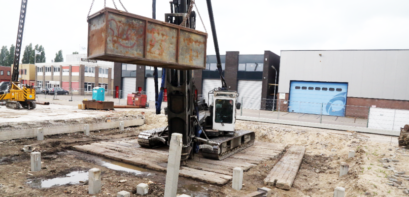 Zodra het heien van de betonnen palen is afgerond wordt gestart met de funderingswerk-zaamheden en het opmetselen van de muren van het bedrijfsverzamelgebouw.