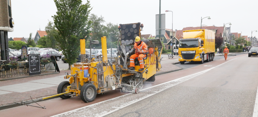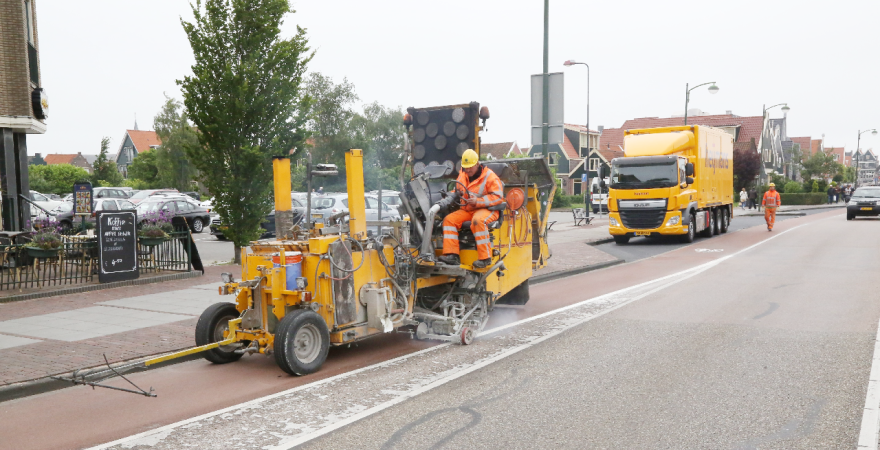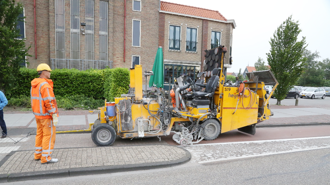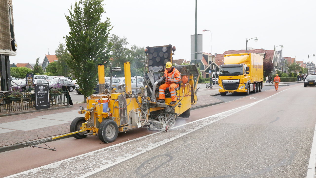 In opdracht van de gemeente worden in heel Edam-Volendam de slechte delen van de belijning op de wegen vernieuwd.
