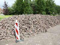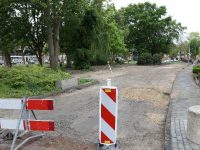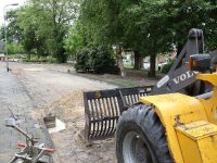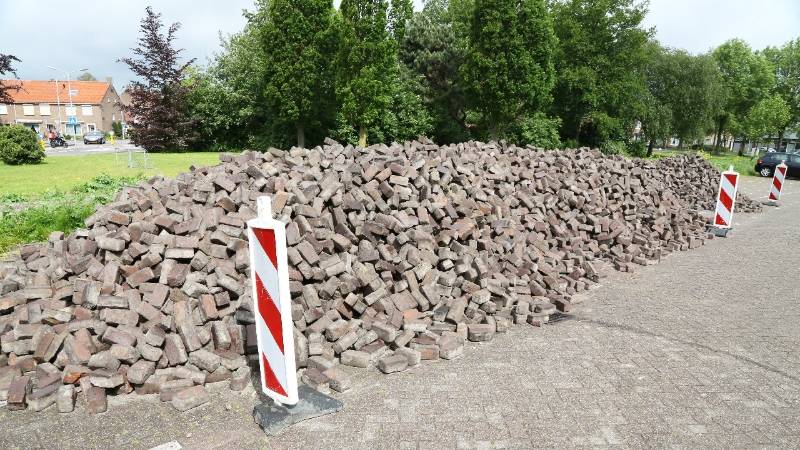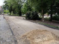 Het wegdek zat hier vol met spoorvorming. Nabij de kruising met de Sint Vincentiusweg is begonnen met het verwijderen van de straatklinkers en het ophogen met zand.