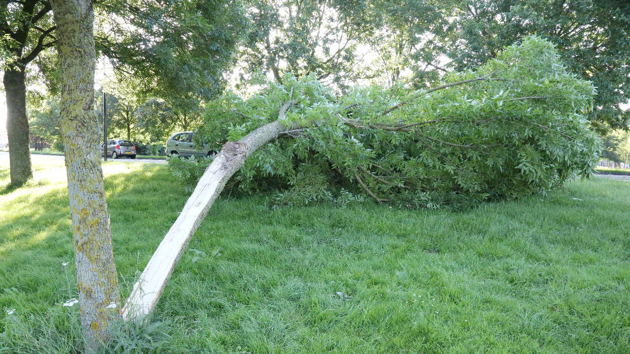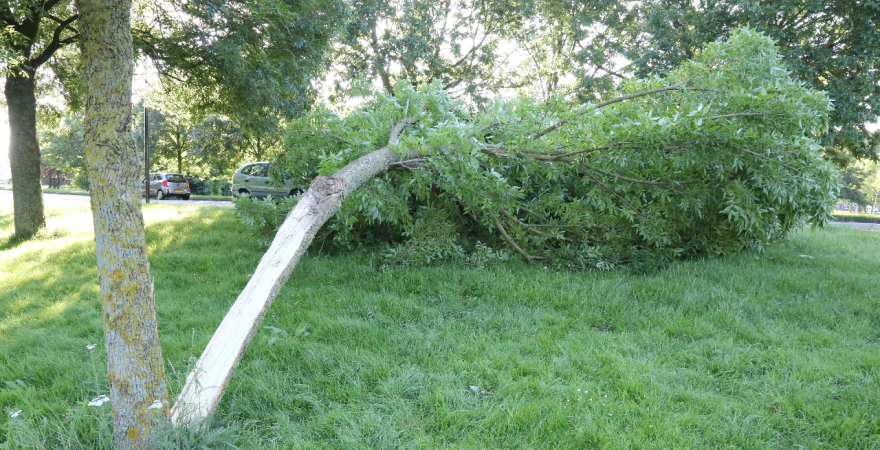 Een deel van de boom bleef rechtop staan en de andere helft stortte naar beneden. Gelukkig liepen er geen wandelaars langs op het pad, zodat persoonlijke ongelukken achterwege bleven.