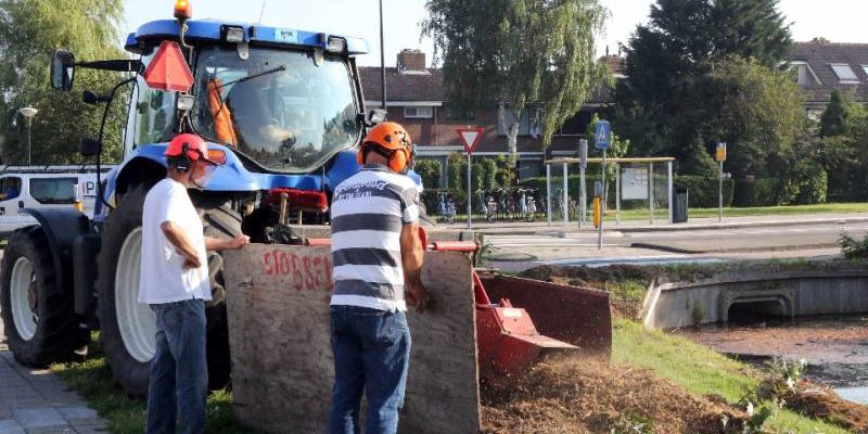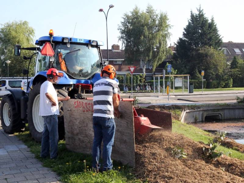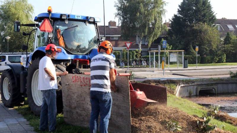 Op gezette tijden wordt een zware verpulveraar gehuurd om de boomstronken te vermalen tot kleine stukjes hout. Dat was vrijdag ook het geval op de hoek Heideweg/Leendert Spaanderlaan.