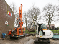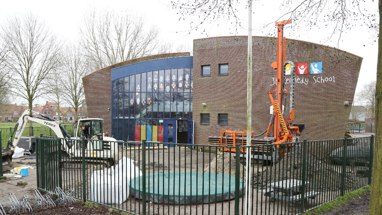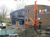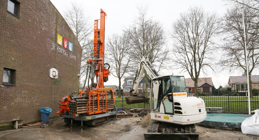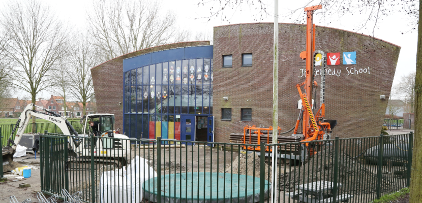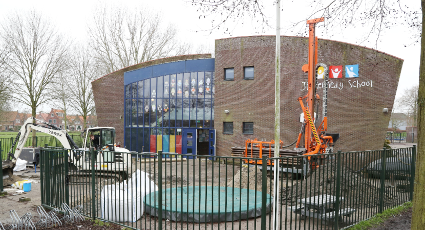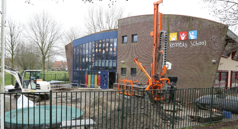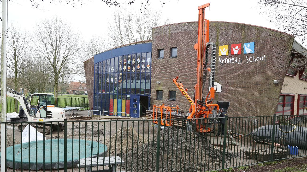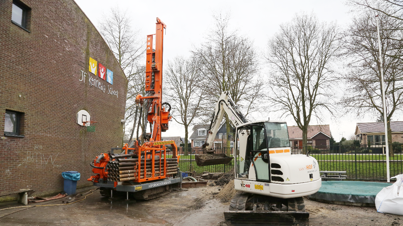 Afgelopen vrijdag vonden graaf- en boorwerkzaamheden plaats op de pleinen van de J.F. Kennedy- en Sint Nicolaasschool in het Boelenspark. In opdracht van de SKOV worden op elk van de schoolpleinen vijf putten van 100 meter diepte geboord.