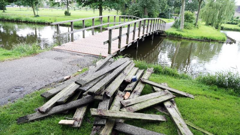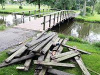 De oude (deels verrotte) hardhouten planken van het brugdek werden verwijderd en afgevoerd. Hier zijn nieuwe hardhouten planken voor teruggeplaatst.
