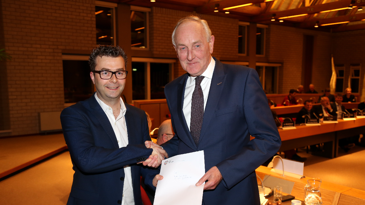 Donderdag bracht Dhr Remkes, Commissaris van de Koning, een bezoek aan de raadsvergadering. Hij kreeg uit handen van Vincent Tuijp het rapport met de profielschets aangeboden. Iwan Visscher (VD|80) is nieuw in de gemeenteraad gekomen. Hij neemt de plek in van Marisa Kes.