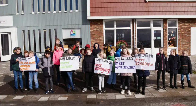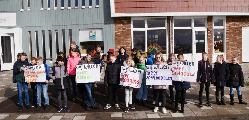 Kinderen als Luuk en Bart kunnen nu al voetballen op het schoolplein. Alleen is de mogelijkheid daartoe beperkt. Ze mogen het balspel alleen spelen in de daarvoor bestemde ‘voetbalkooi’. Bart: ,,We zouden daarom heel graag een veldje willen hebben waar we op kunnen voetballen. Doordat we weinig ruimte hebben, gaat de bal nu vaak over het hek in de sloot en het weiland. Sowieso hebben we ook bomen nodig voor verkoeling. Want in de zomer werd het 32, 34 graden. Toen bleven we liever binnen, omdat het prettiger was om daar te zitten. Als we dan buiten zijn, zit iedereen dichtbij elkaar op dezelfde schaduwplek. Anders krijg je het veel te warm.”