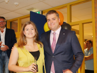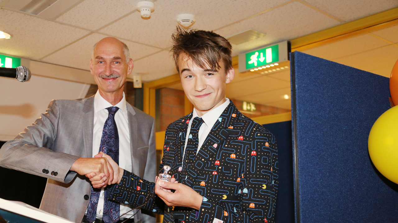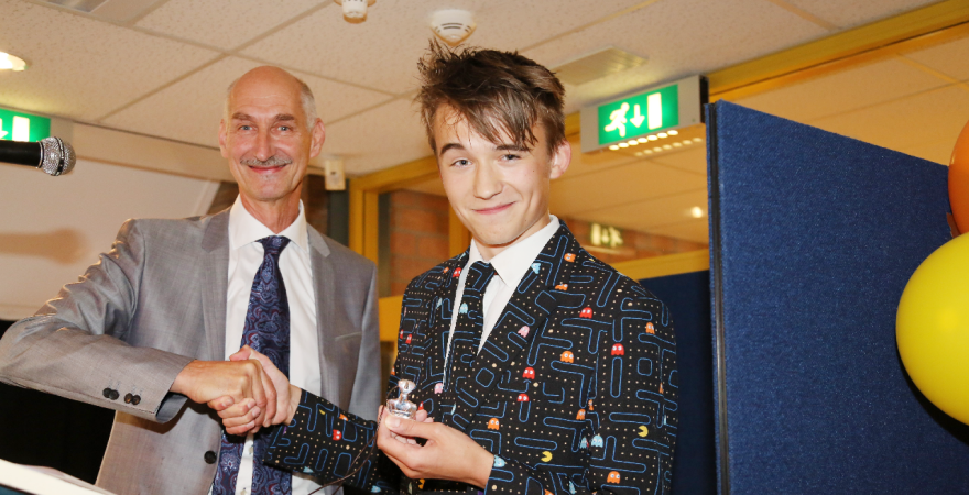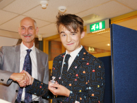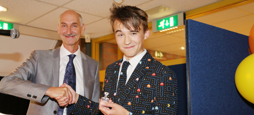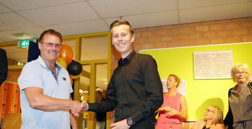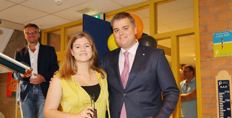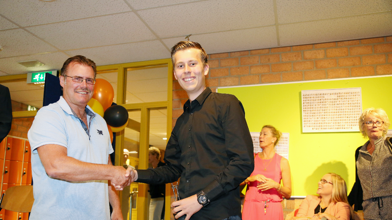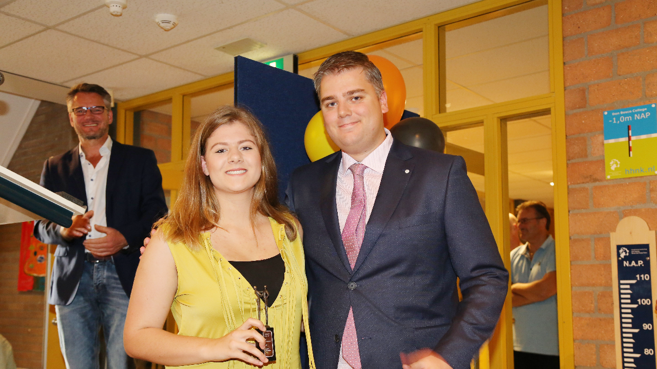 Vervolgens kregen de beste leerlingen een bronzen beeldje. Bij de afd. HAVO was dit Donna Schilder, die cum laude geslaagd is. Bij VWO was de beste leerling Peter Kemper, die eveneens cum laude slaagde.