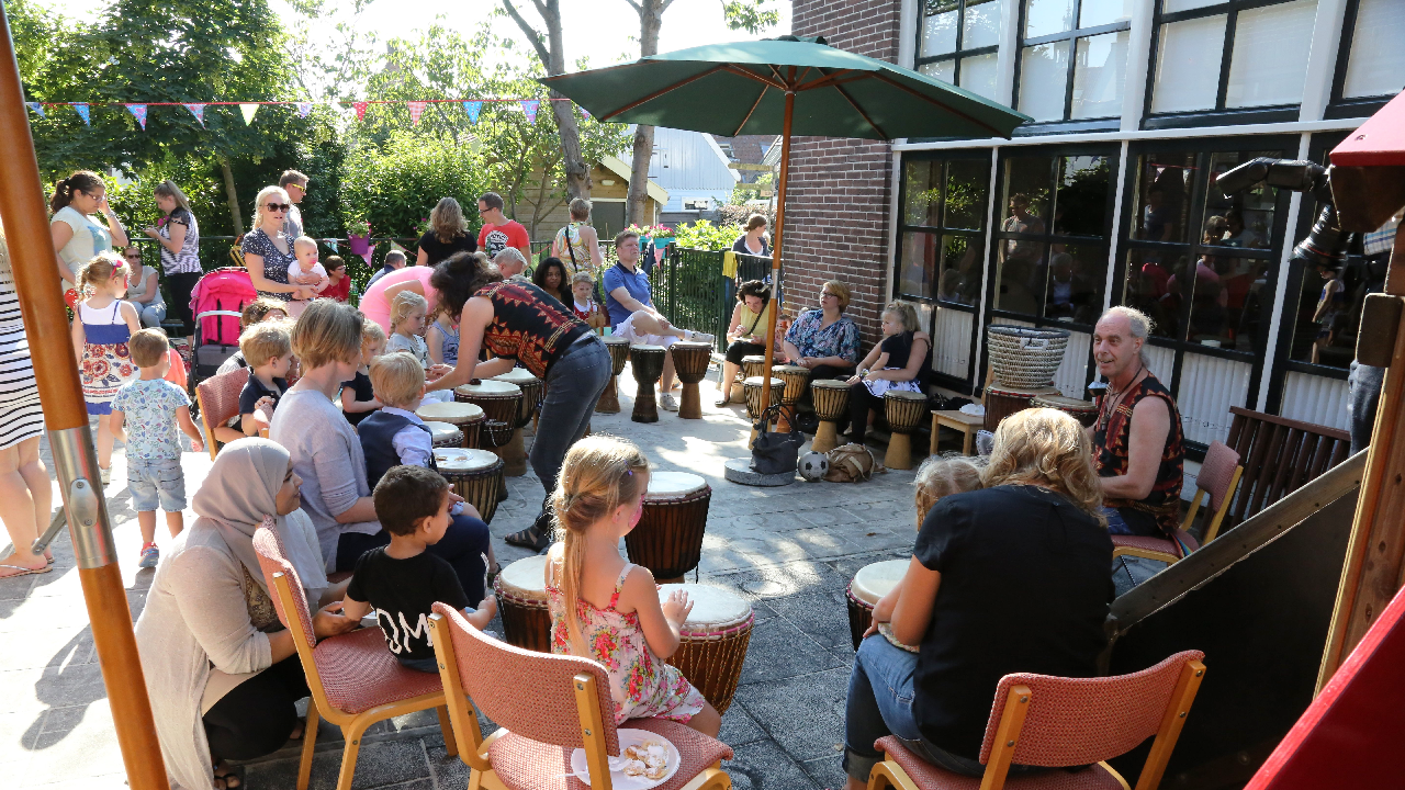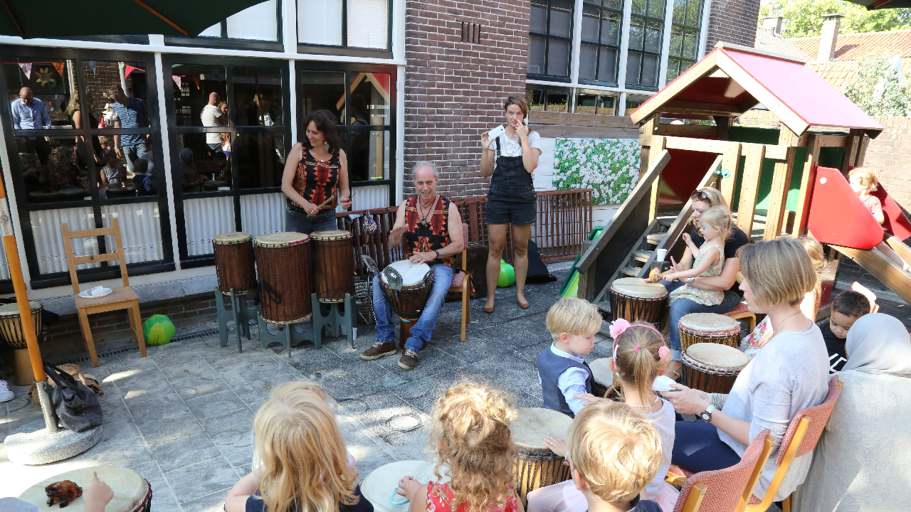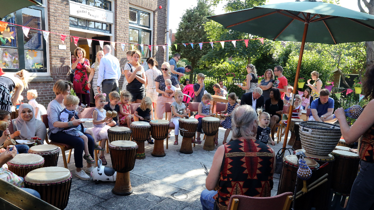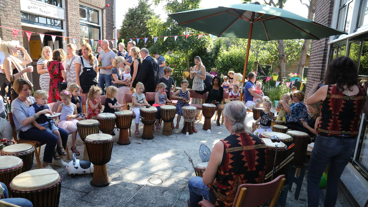 Er was een verrassing op touw gezet door “Diedel Dumpie”. Naast hapjes en drankjes voor de ouders, werden poffertjes gebakken en was er voor de kinderen een djembé workshop georganiseerd. Vele trommels waren neergezet op de buitenspeelplaats en aan de kinderen werden muziekinstrumentjes uitgedeeld. Het djembé optreden begon om 17.45 uur en een half uur lang werd er volop getrommeld.