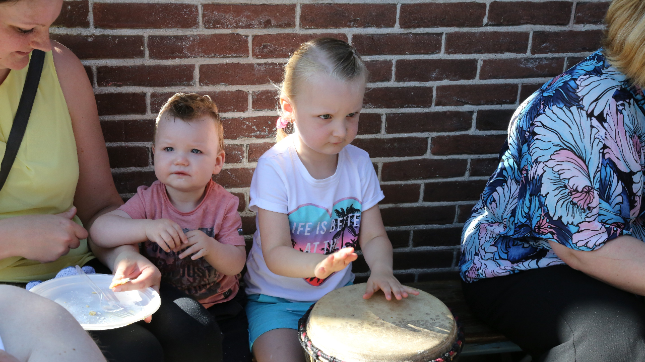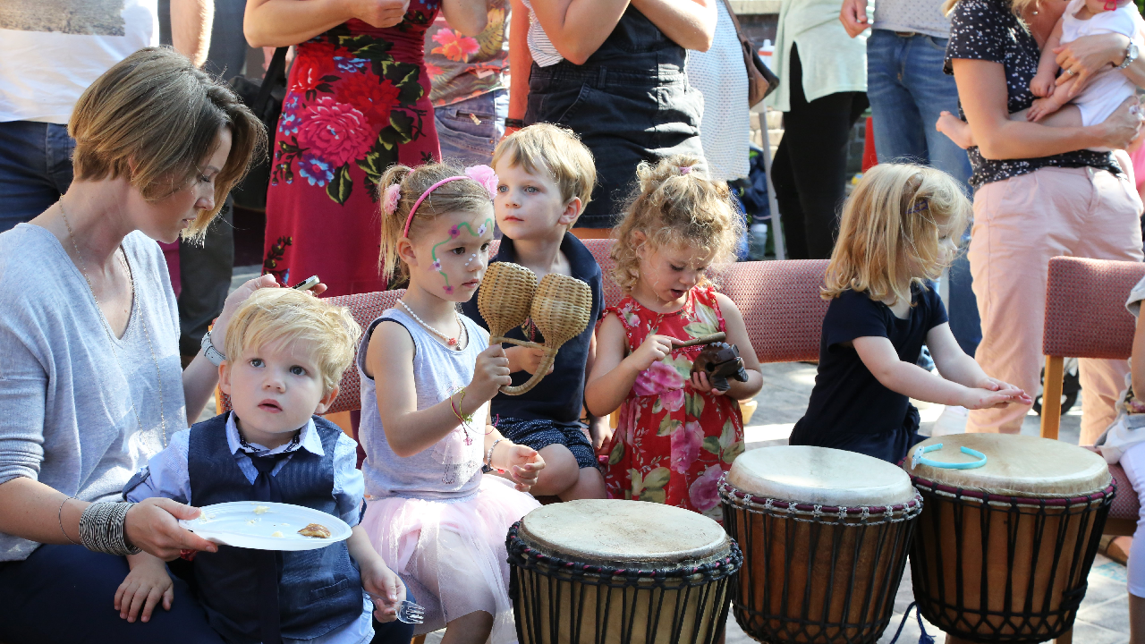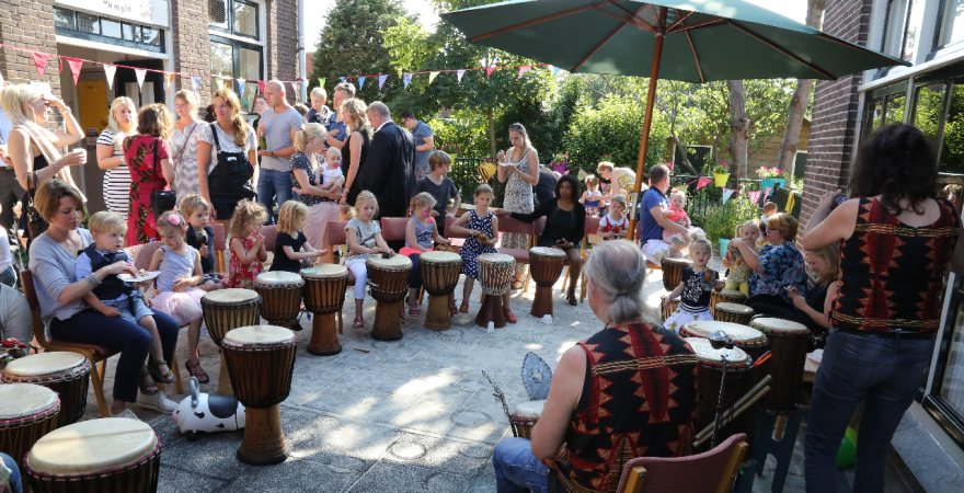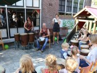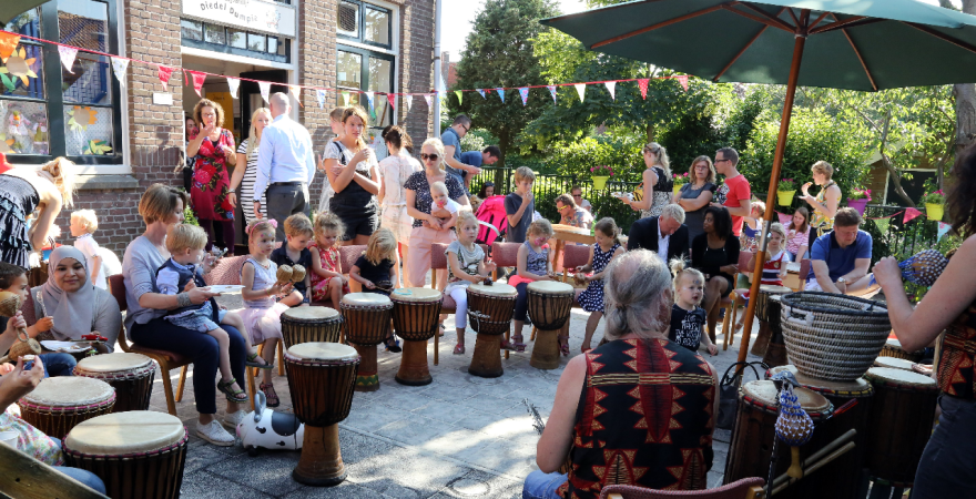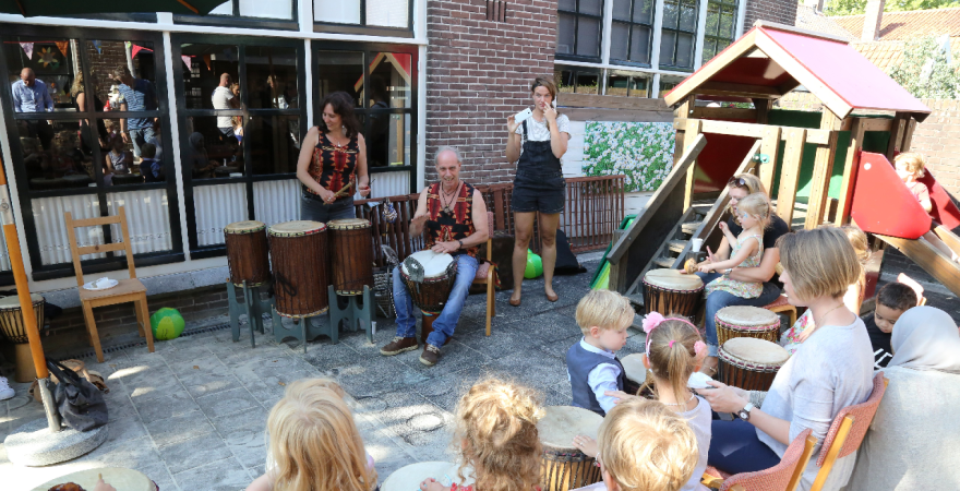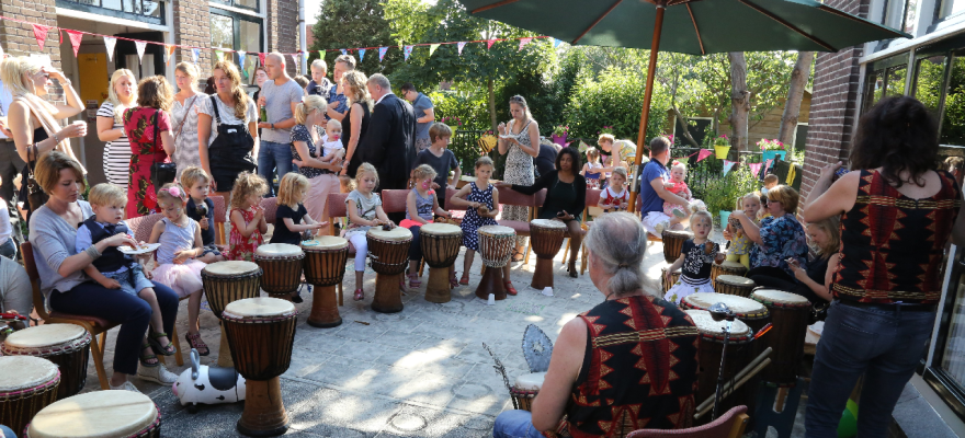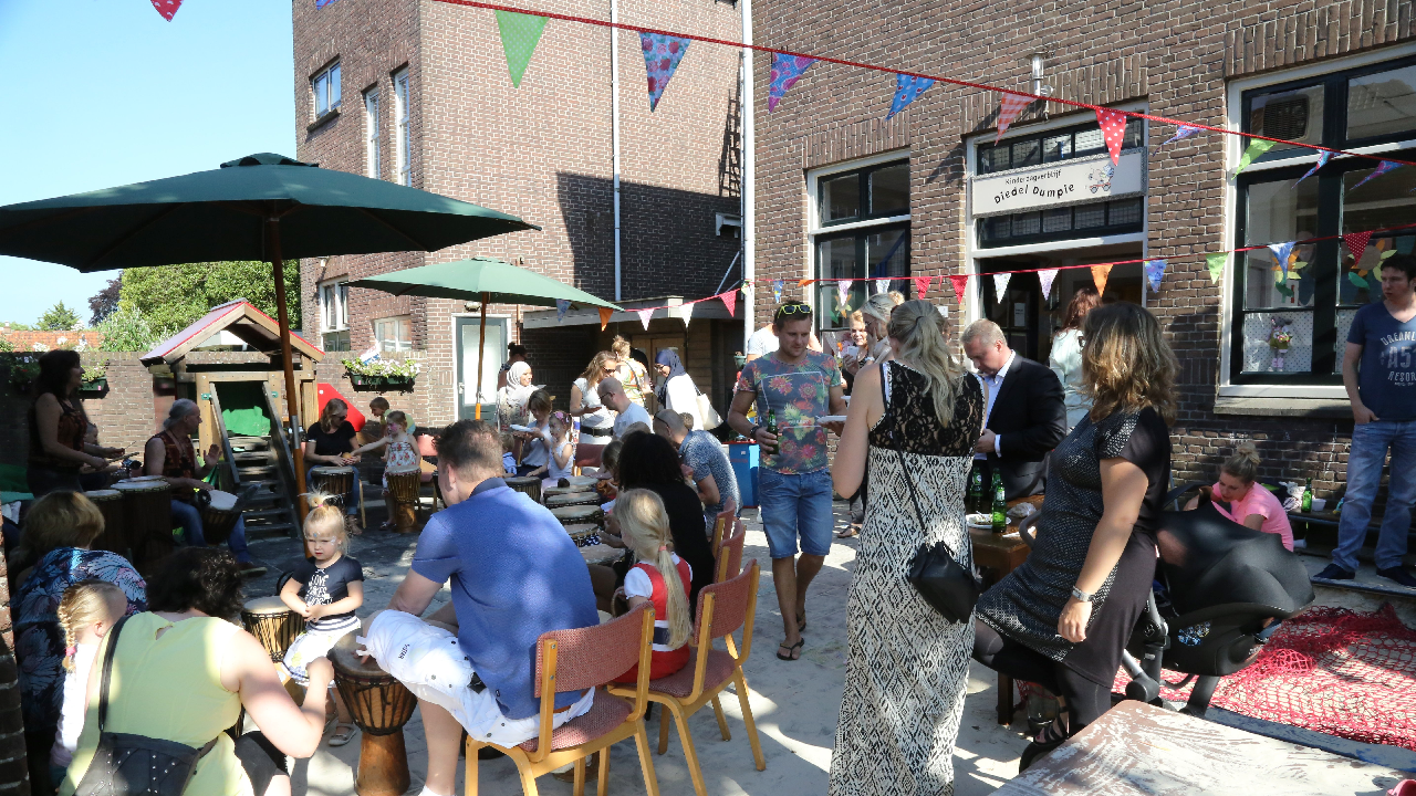 Er was een verrassing op touw gezet door “Diedel Dumpie”. Naast hapjes en drankjes voor de ouders, werden poffertjes gebakken en was er voor de kinderen een djembé workshop georganiseerd. Vele trommels waren neergezet op de buitenspeelplaats en aan de kinderen werden muziekinstrumentjes uitgedeeld. Het djembé optreden begon om 17.45 uur en een half uur lang werd er volop getrommeld.