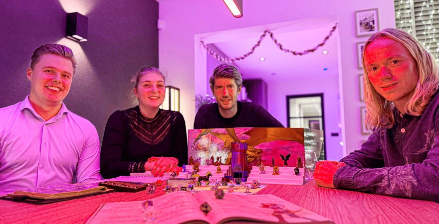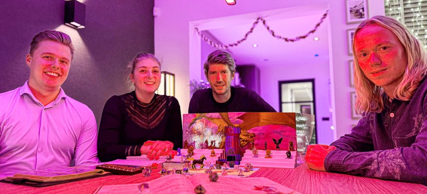 De aanval kwam uit het niets. Een gigantische roc, een oervogel groter dan een lijnbus, dook neer op een rotsplateau dat alleen bestaat in de fantasie van zes Volendammers en één Dungeon Master. De vogel grijpt een van de spelers. De rest bladert nerveus door karakterbladen. ,,We hebben nog rantsoen, toch? Misschien die zak eten gooien?” stelt iemand voor. Het klinkt als een wanhopig idee. En eigenlijk is dat het ook. Tot de dobbelsteen over tafel rolt en op een twintig blijft liggen.