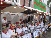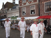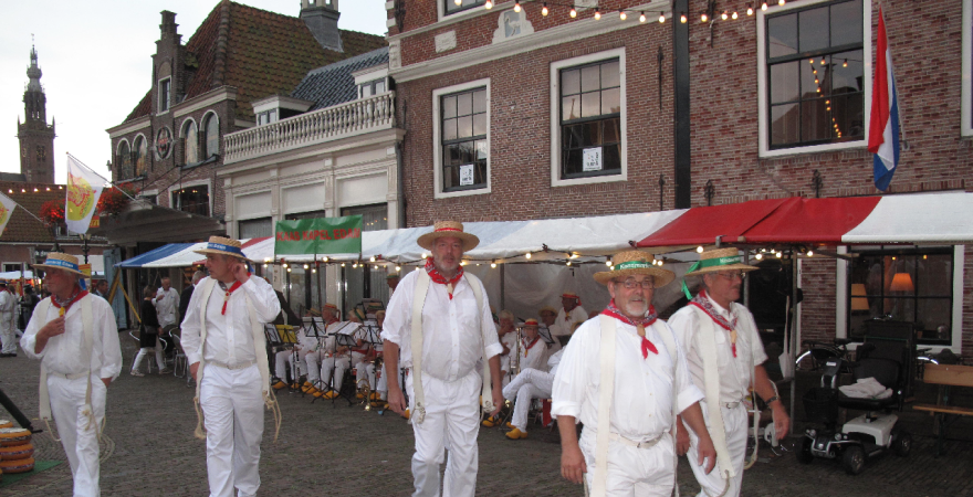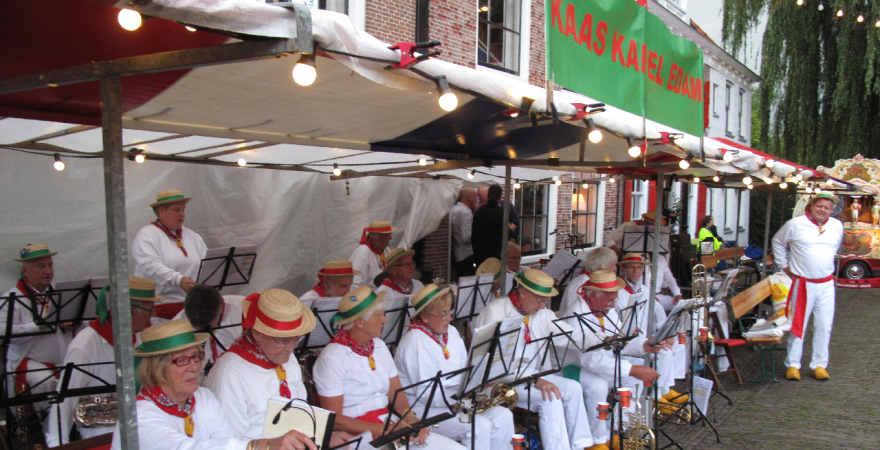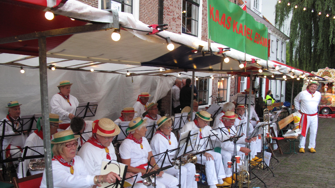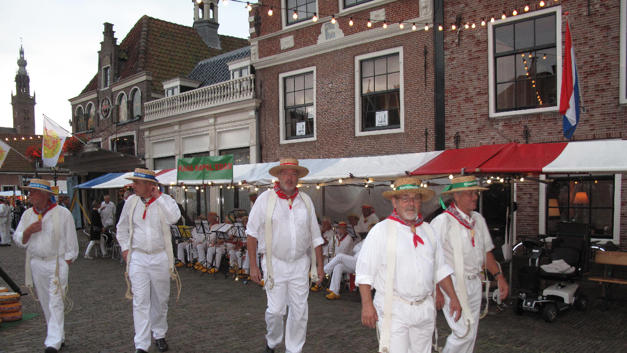 Het was zaterdagavond een drukte van belang in het centrum waar de markt en kaasmarkt plaatsvond. Ook de terrassen zaten bomvol. De Kaasmarkt was sfeervol verlicht. Tijdens de markt werd muziek gespeeld door de Edamse Kaaskapel.