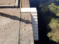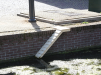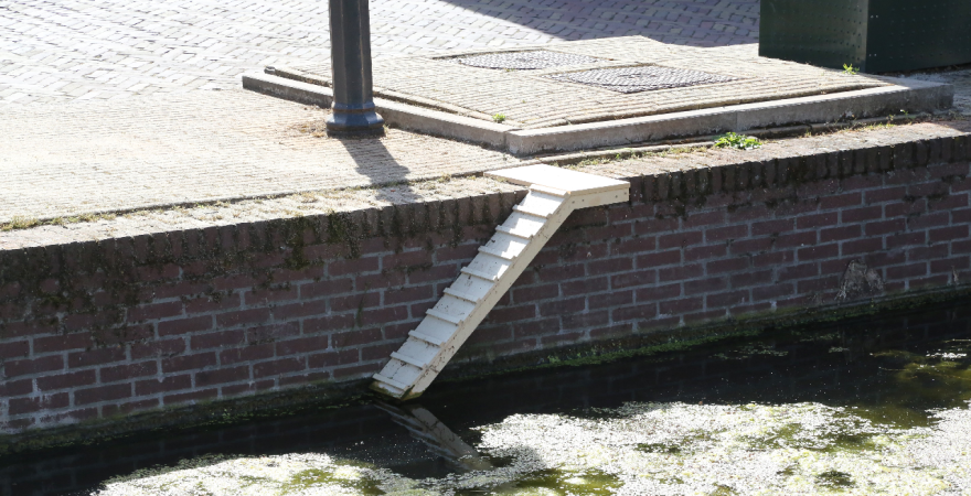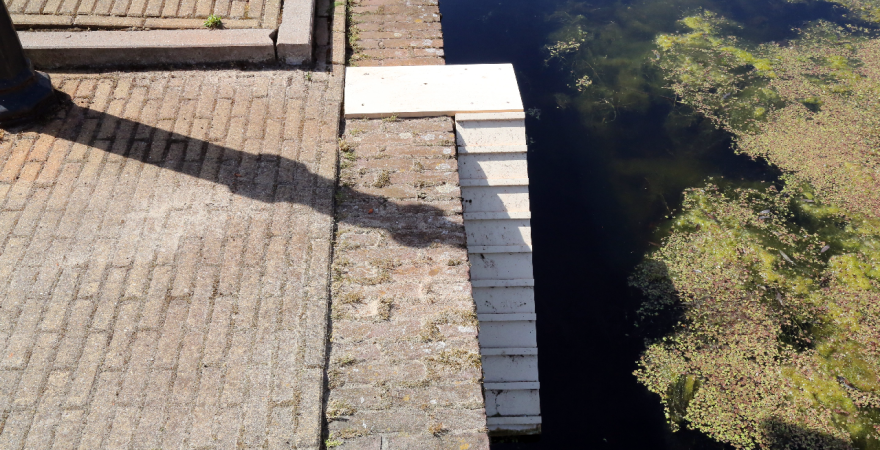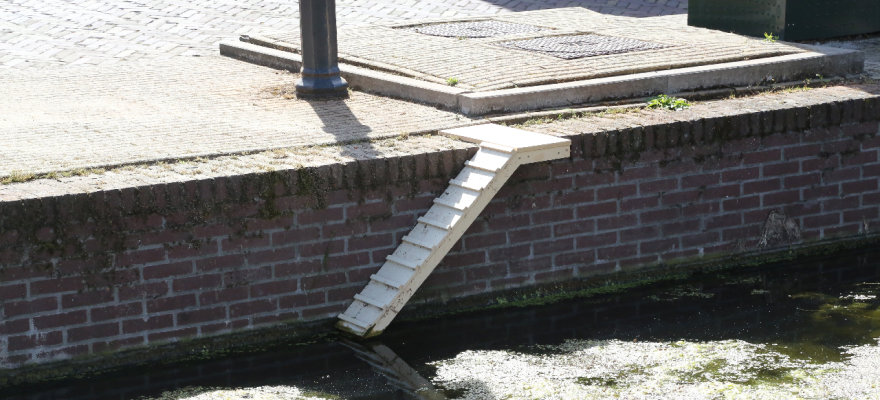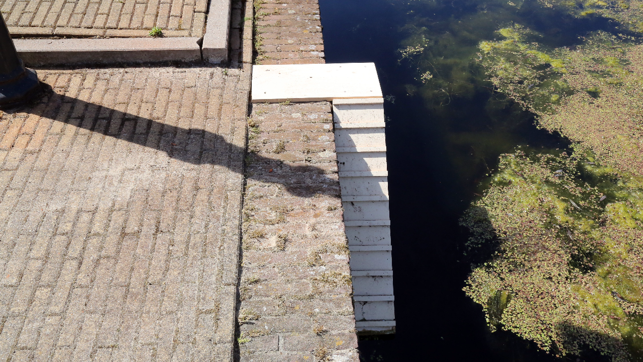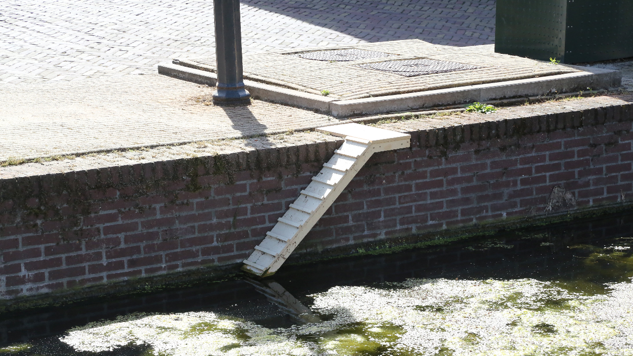 In het verleden was al bij de gemeente het verzoek ingediend om over de gehele lengte van de kademuur een plank te bevestigden, zodat de katten en eenden hierop konden klimmen. Dat was echter een te dure oplossing. Door dit houten eendentrapje is dit euvel nu ook opgelost.