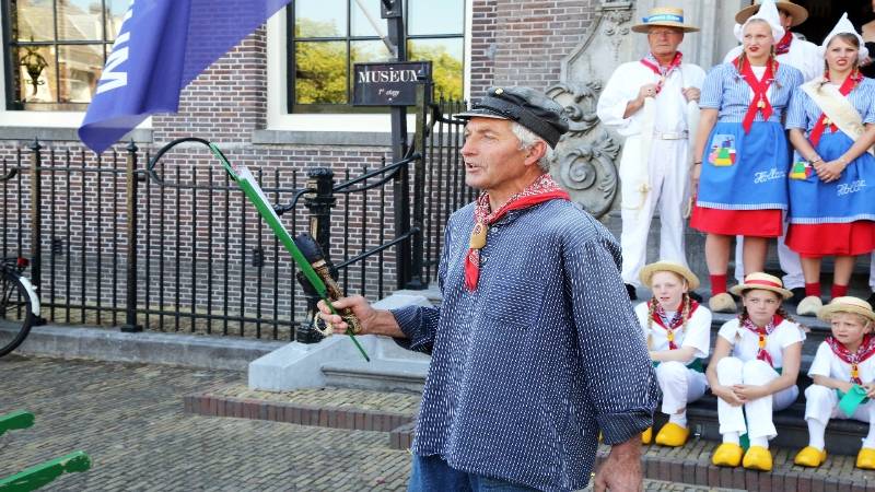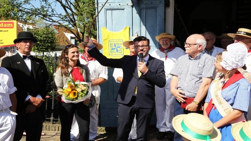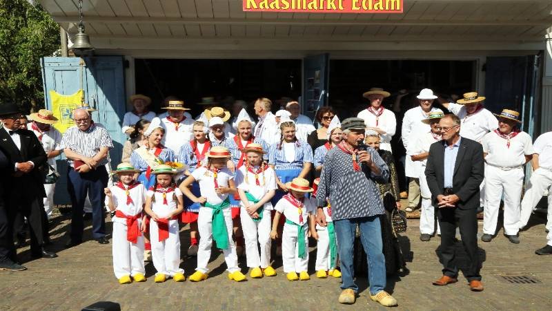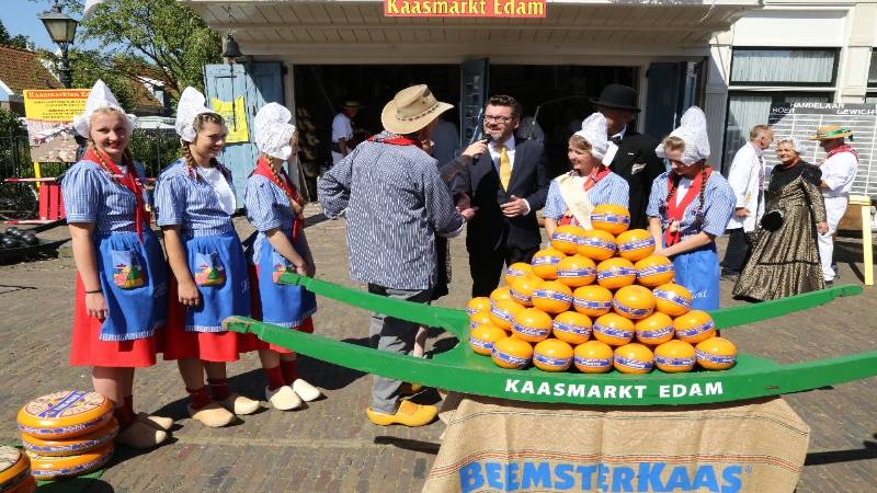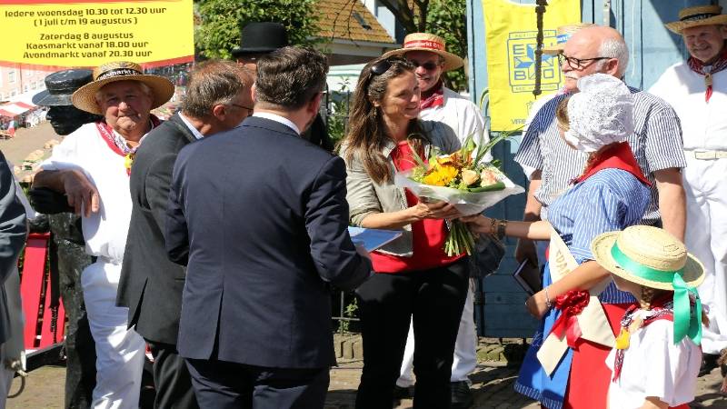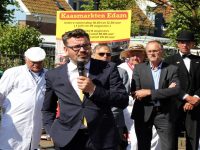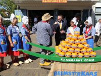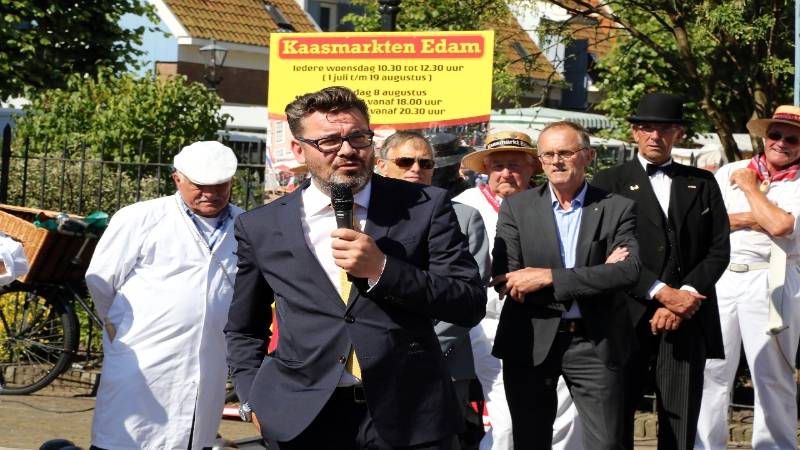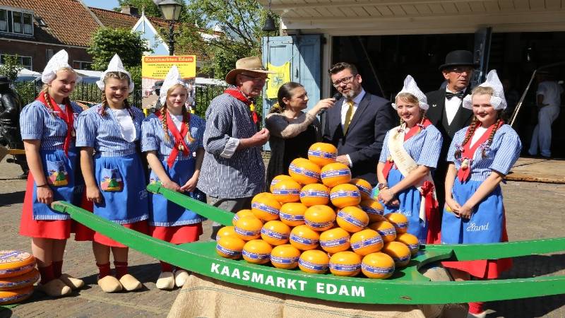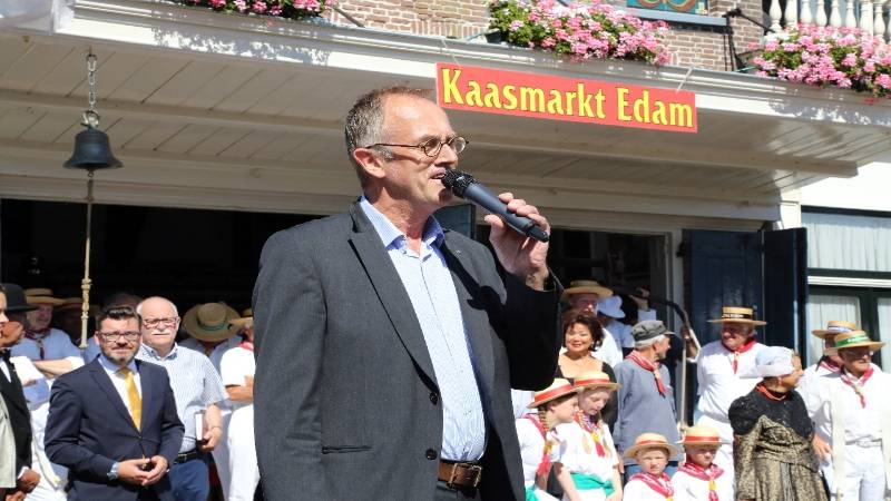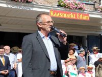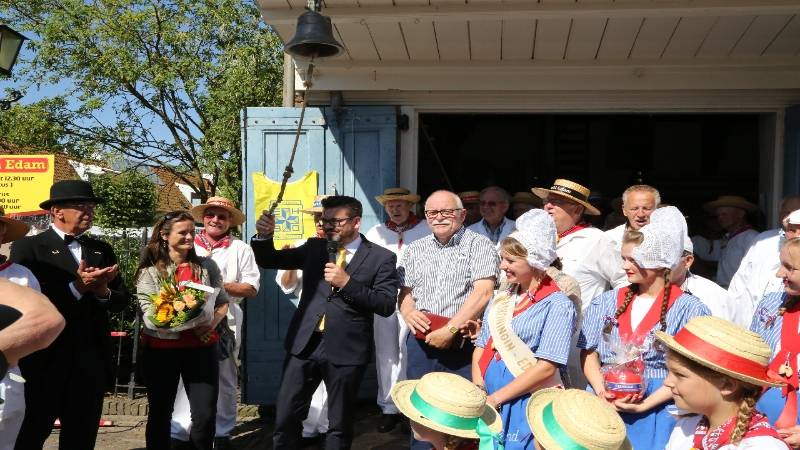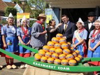 Hij werd in het stadhuis ontvangen door voorzitter Gerro de Boer.Na het “Rondje Edam” met de Kaaskapel voorop, opende Dhr. De Vries om 10.30 uur de Kaasmarkt met het luiden van de bel. Meteen al was er veel belangstelling en vele toeristen beleefden een mooie ochtend in het oude centrum van Edam.