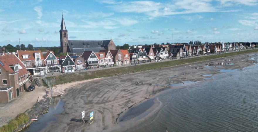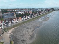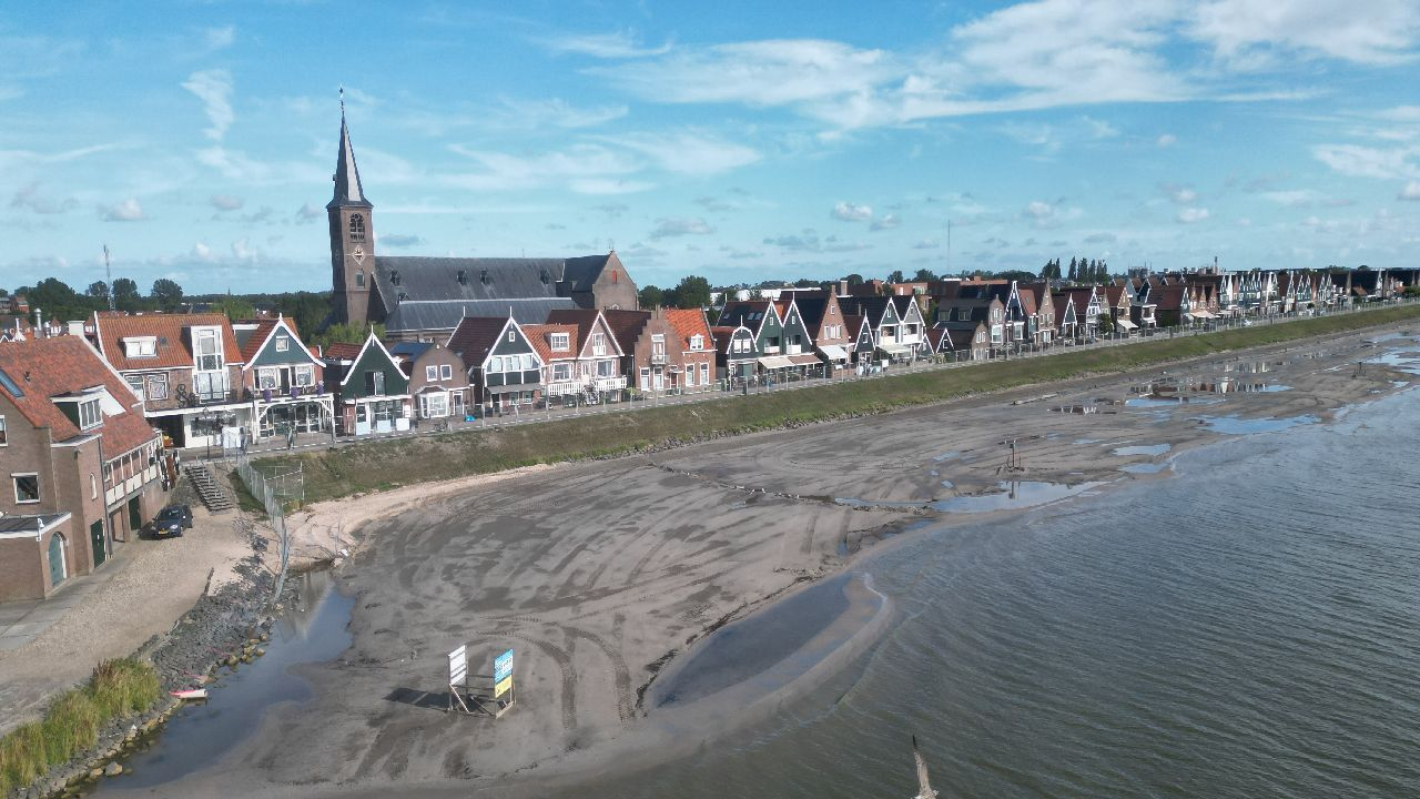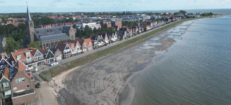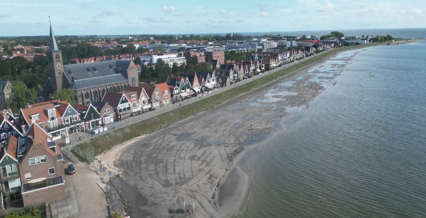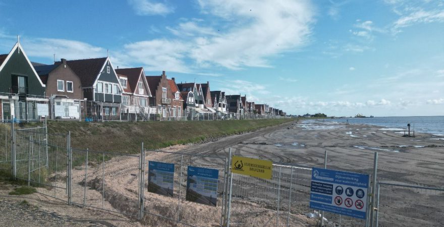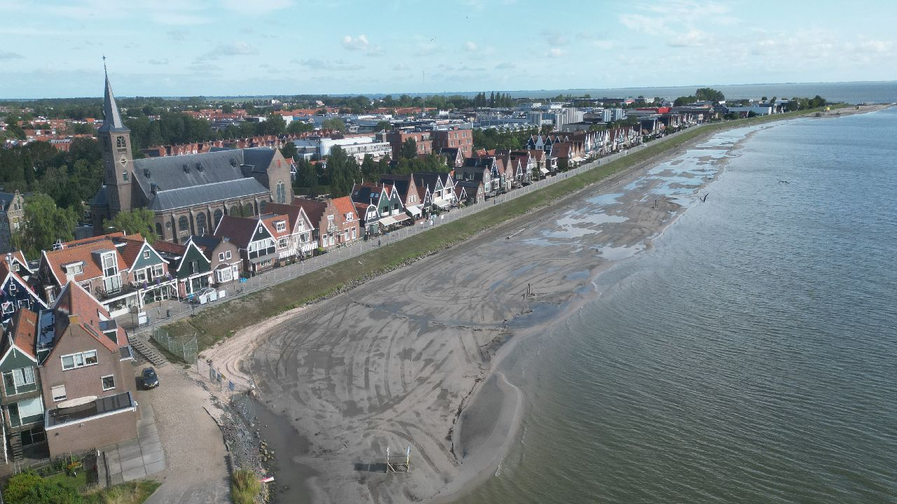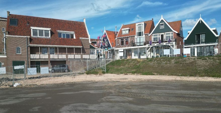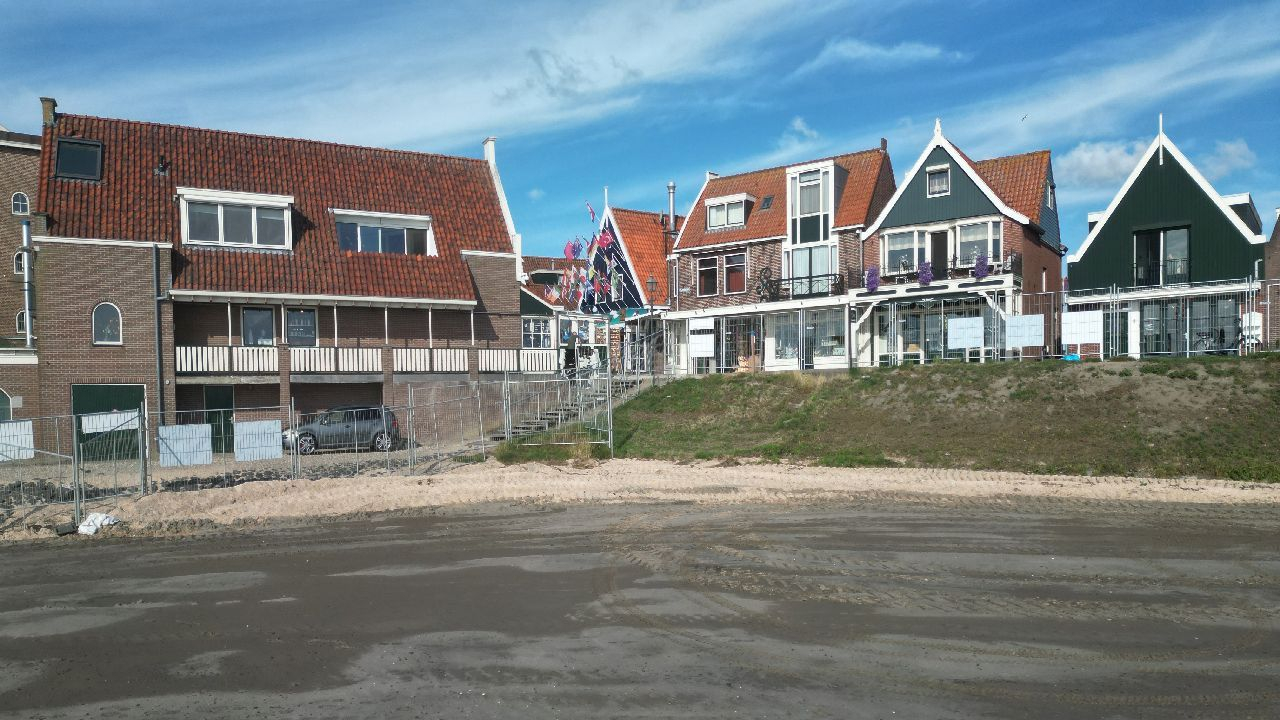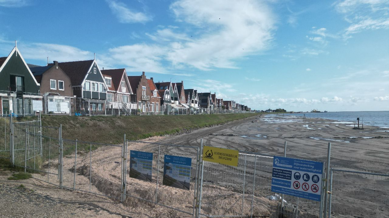 Het pittoreske strandje is vrijdagmorgen opgeslokt door het grootschalige dijkversterkings-project van de Alliantie Markermeerdijken. Met een roze bril op kunnen de ontwikkelingen ook worden gezien als uitbreiding van het bescheiden strandje.
