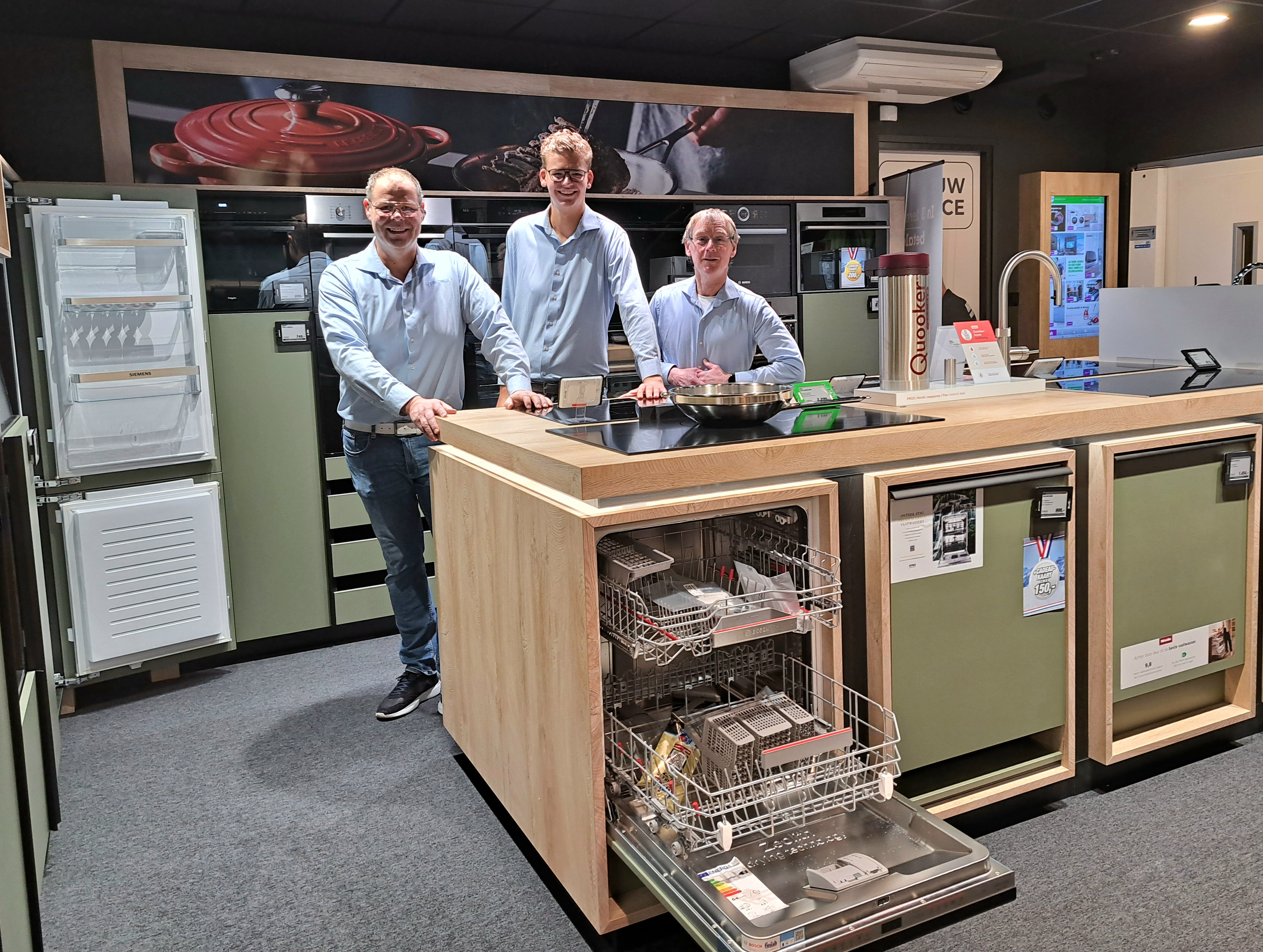 In de winkel van EP:Beerepoot aan de Julianaweg is het zelden stil. Achter de toonbank staan Jan Bootsman, Jack Schilder en Kees Bond: een compact team met service hoog in het vaandel. Wie EP:Beerepoot alleen kent van de showroom op straatniveau, mist de ruime showroom in de kelder waar je een compleet assortiment inbouwapparatuur vindt. Van inbouwvaatwassers, koelkasten en inbouwovens tot kookplaten, afzuigkappen, pannen en (combi-)magnetrons. “Alles om je keuken een upgrade te geven,” zegt Jan. “En vooral: snel en goed. Want zonder koelkast wil niemand dagenlang zitten.”