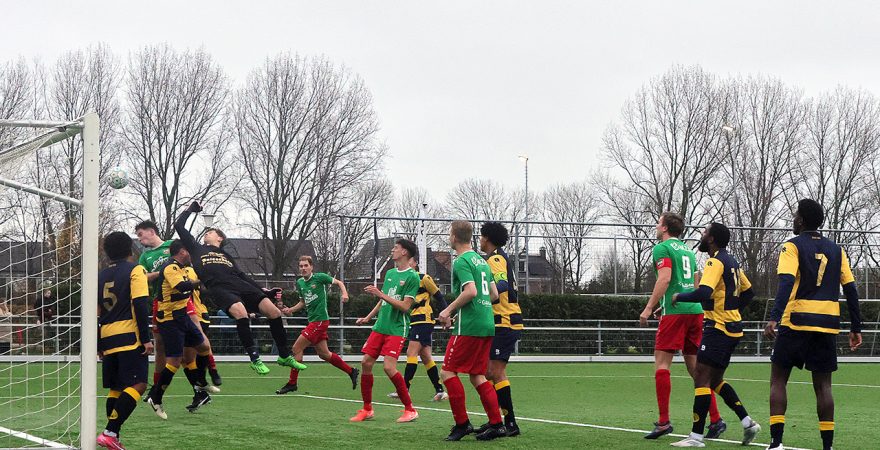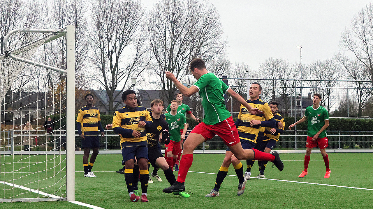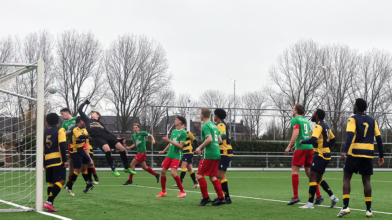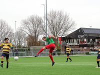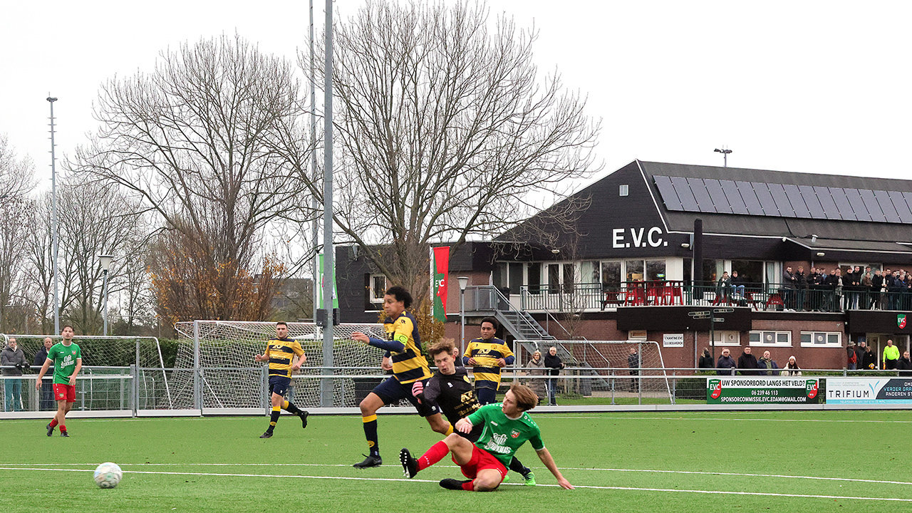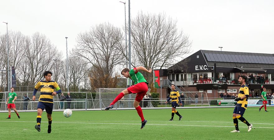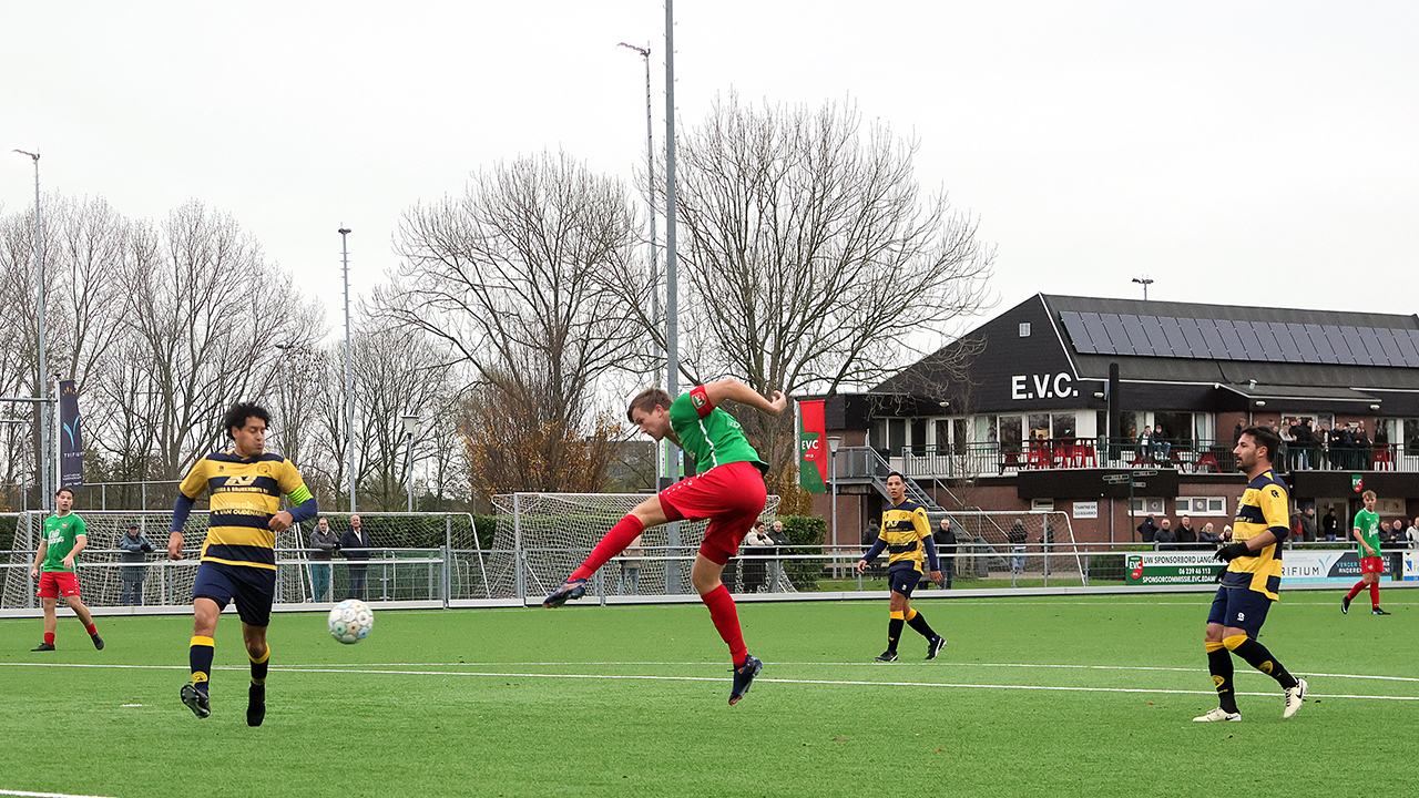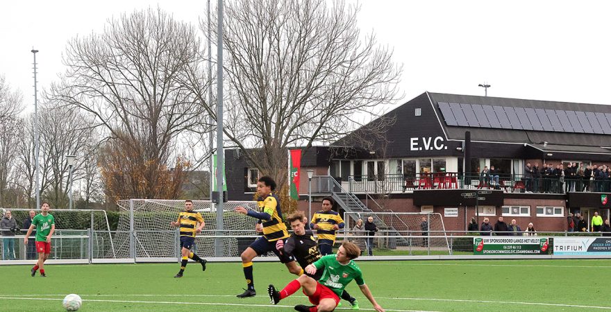 Na rust stuitten de EVC-aanvallers herhaaldelijk op de uitblinkende doelman van ZVC’22, die tevens de aanval opzette waaruit de 1-3 ontstond. De wedstrijd leek beslist, maar Mark Uijlenhoed bracht de spanning terug met een rake kopbal op aangeven van Vince Mens.