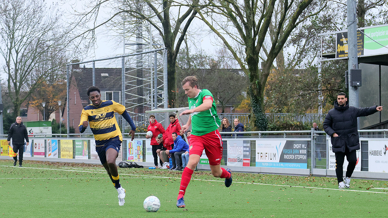 ZVC’22, een degelijk en compact spelende ploeg, zakte ver in en loerde op de counter. Dat betaalde zich in de 21e minuut uit toen een afgeslagen hoekschop vanaf de zestienmeterlijn werd binnen geschoten. Even later had Milan Greuter pech: zijn schot uit een pass van Daniël Kemper ging langs de uitgekomen doelman, maar ook net naast de verkeerde kant van de paal. De verdiende gelijkmaker volgde snel; in een druk strafschopgebied tekende Tom Dijkhuizen voor de 1-1. Toch gingen beide teams niet met die stand rusten: vlak voor het fluitsignaal kopte ZVC’22 de 1-2 binnen.