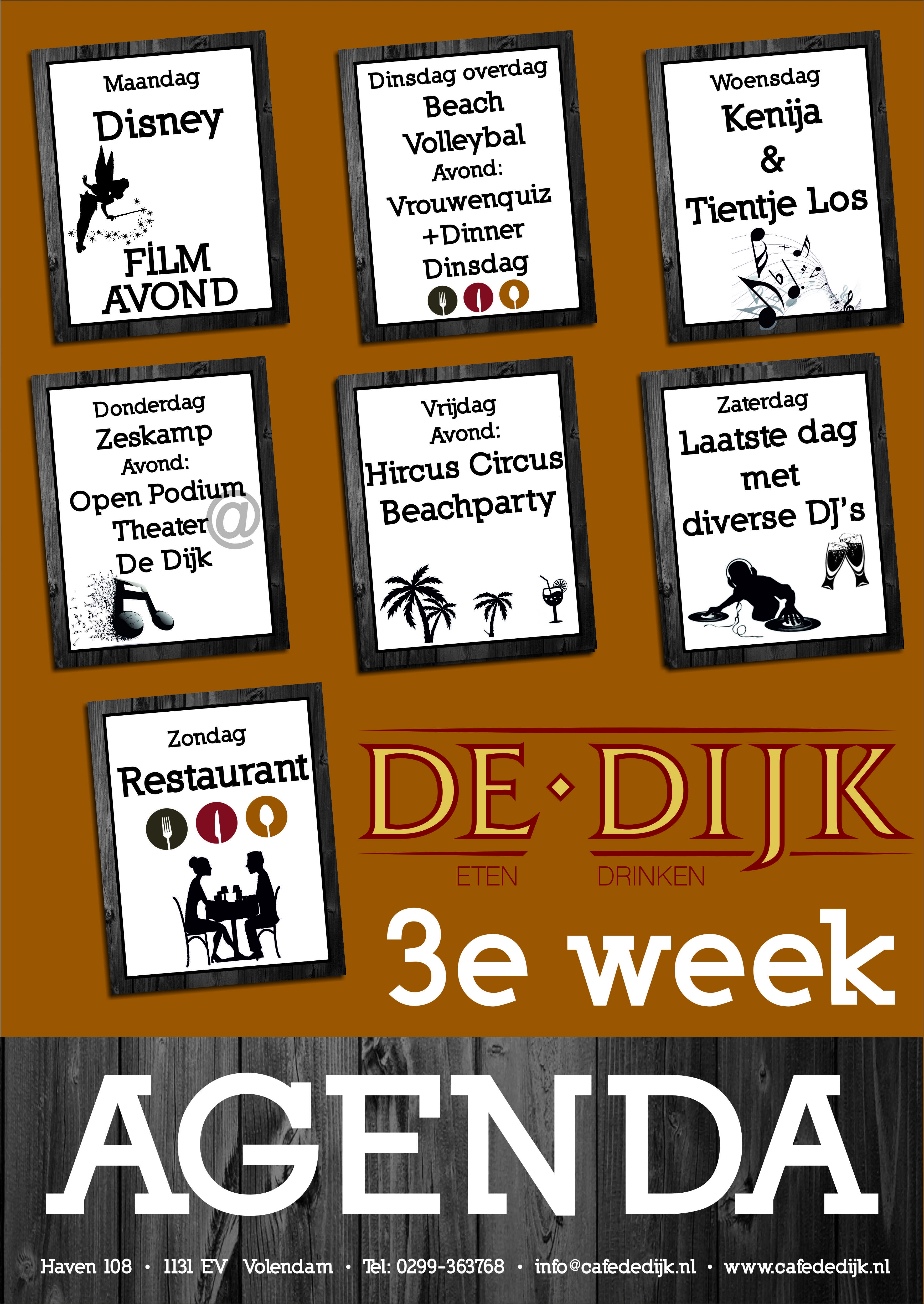 Café de Dijk pakt weer groots uit met een zeer gevarieerd programma met o.a. een filmavond, Beachvolleybal, optredens van Kenija & Tientje Los, een zeskamp en nog véél meer.