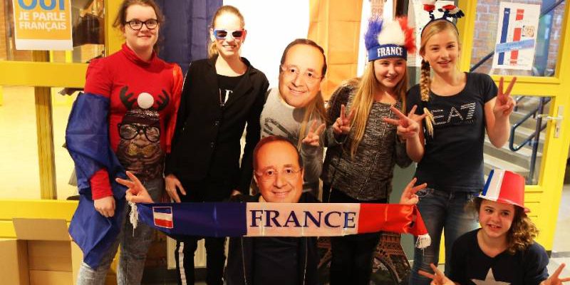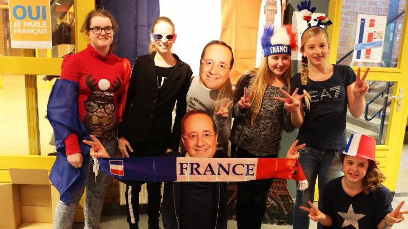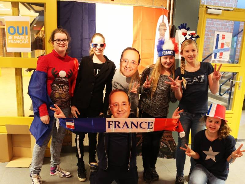 De docentenkamer was rood/wit/blauw versierd en bij de entree was een ballonnenboog geplaatst. De docenten Frans liepen verkleed rond en ook enkele klaslokalen waren in het thema versierd.