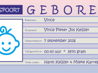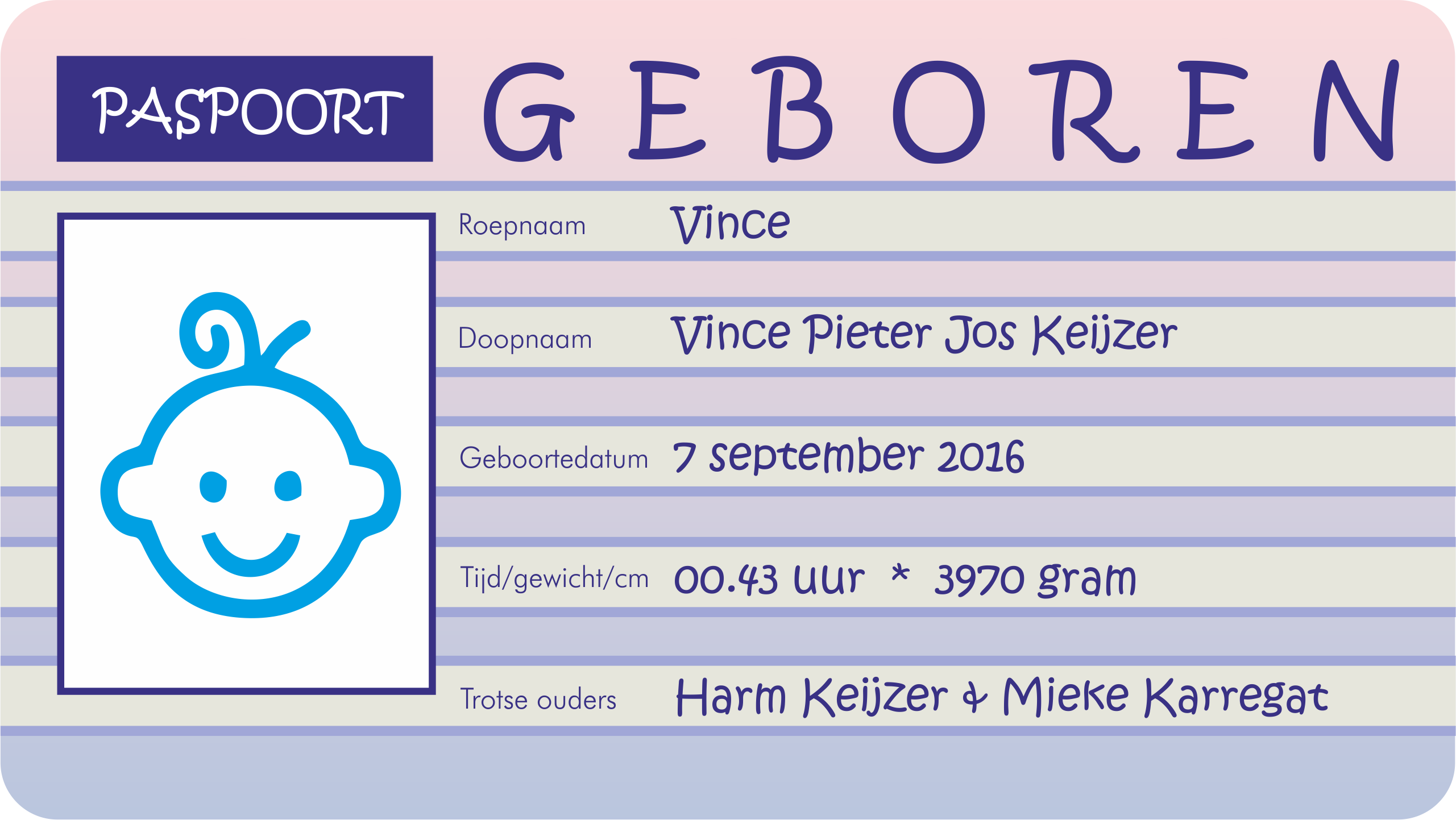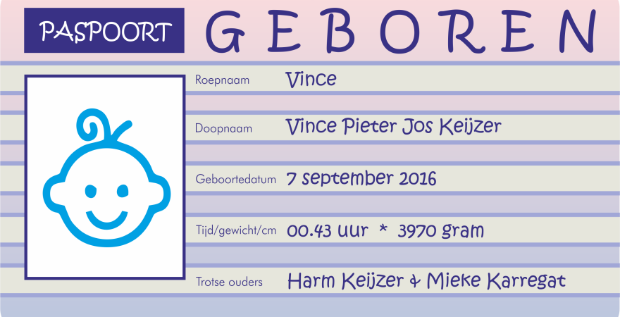 René Schilder Edam-Volendam | 7-9-2016 | 30 sec. leestijd Geboren: Vince Keijzer 7 september 201600.43 uur3970 gram Trotse ouders zijn: Harm Keijzer & Mieke Karregat Fotogalerij Tip de redactie! Gemakkelijk via mail! Deel dit artikel