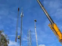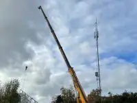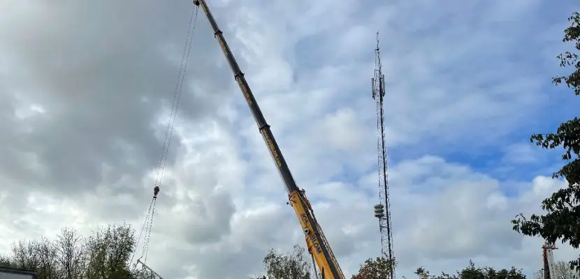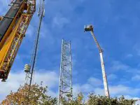 Vanuit het bakje had hij zicht op de hele regio. Nadat de kraan de mastdelen omhoog takelde, was het aan de man in de kraanbak om de montage voor zijn rekening te nemen. Inmiddels is de klus afgerond en torent de nieuwe zendmast overal hoog bovenuit.