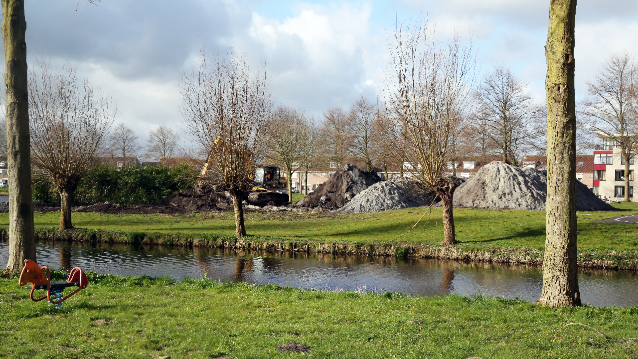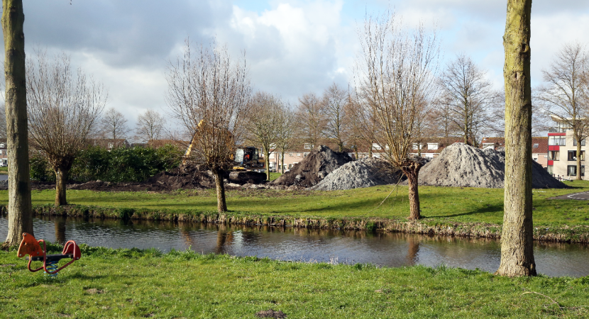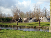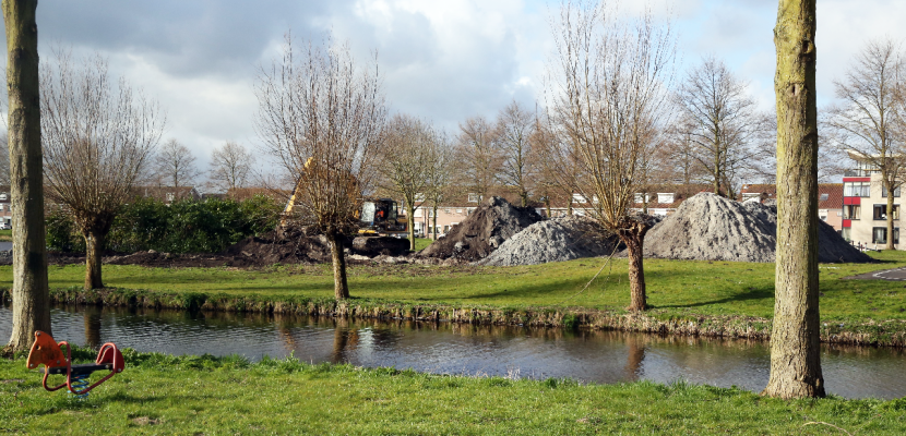 Nadat eerder de bomen en bosschages waren verwijderd door medewerkers van de afdeling Onderhoud & Beheer van de gemeente is vorig week gestart met het opknappen van het terrein. Bergen grond en prut zijn aangevoerd.