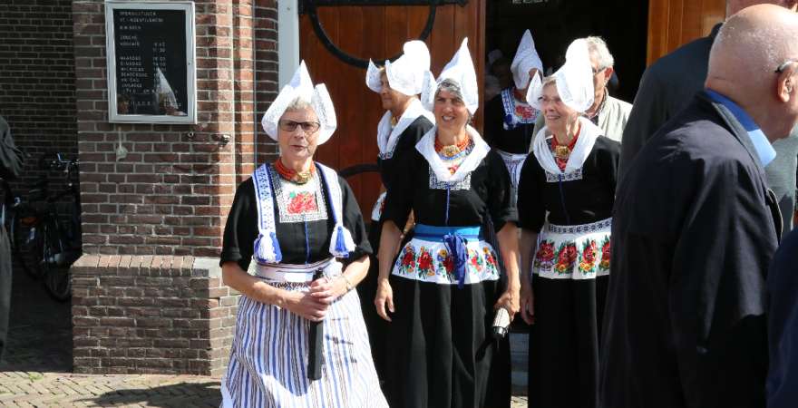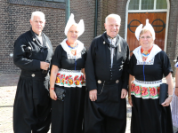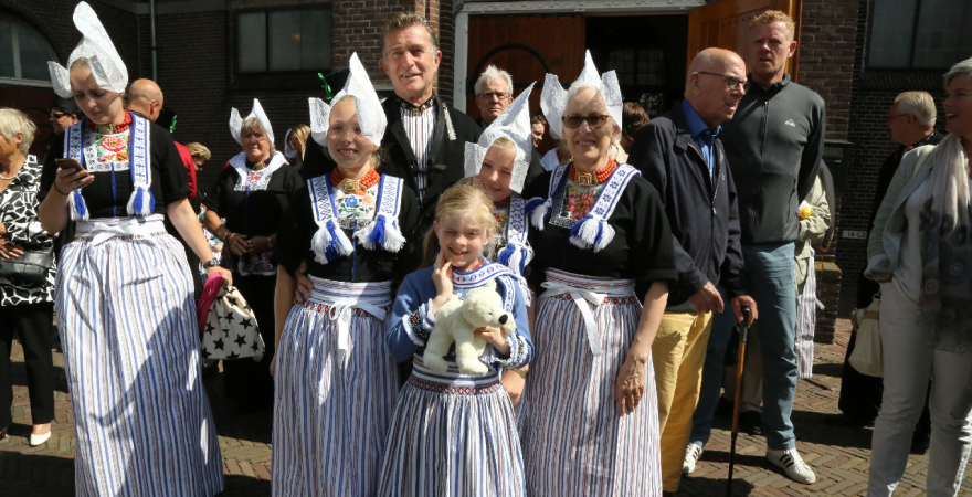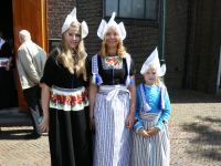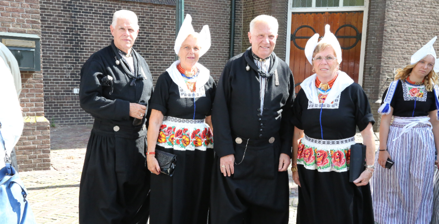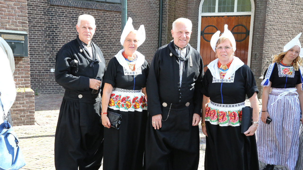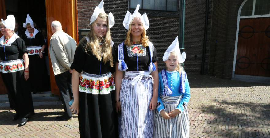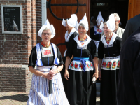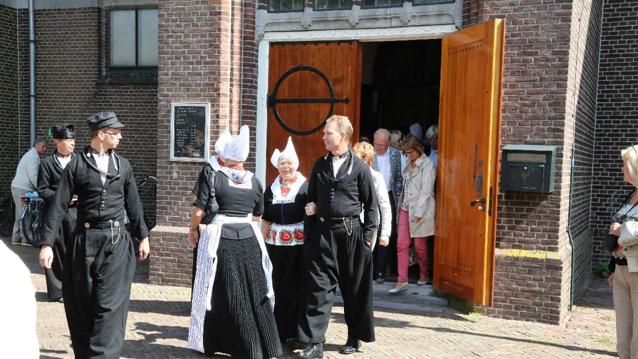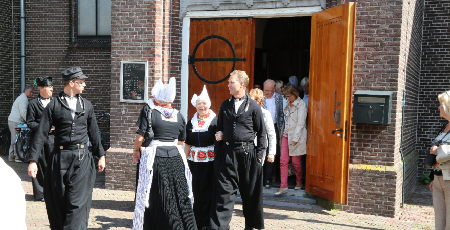 Na de kerkuitgang konden op het Kerkplein weer mooie plaatjes geschoten worden van de deelnemers aan de Volendammerdag die in kostuum ter kerke waren gegaan. Hierna werd gewandeld over de dijk.