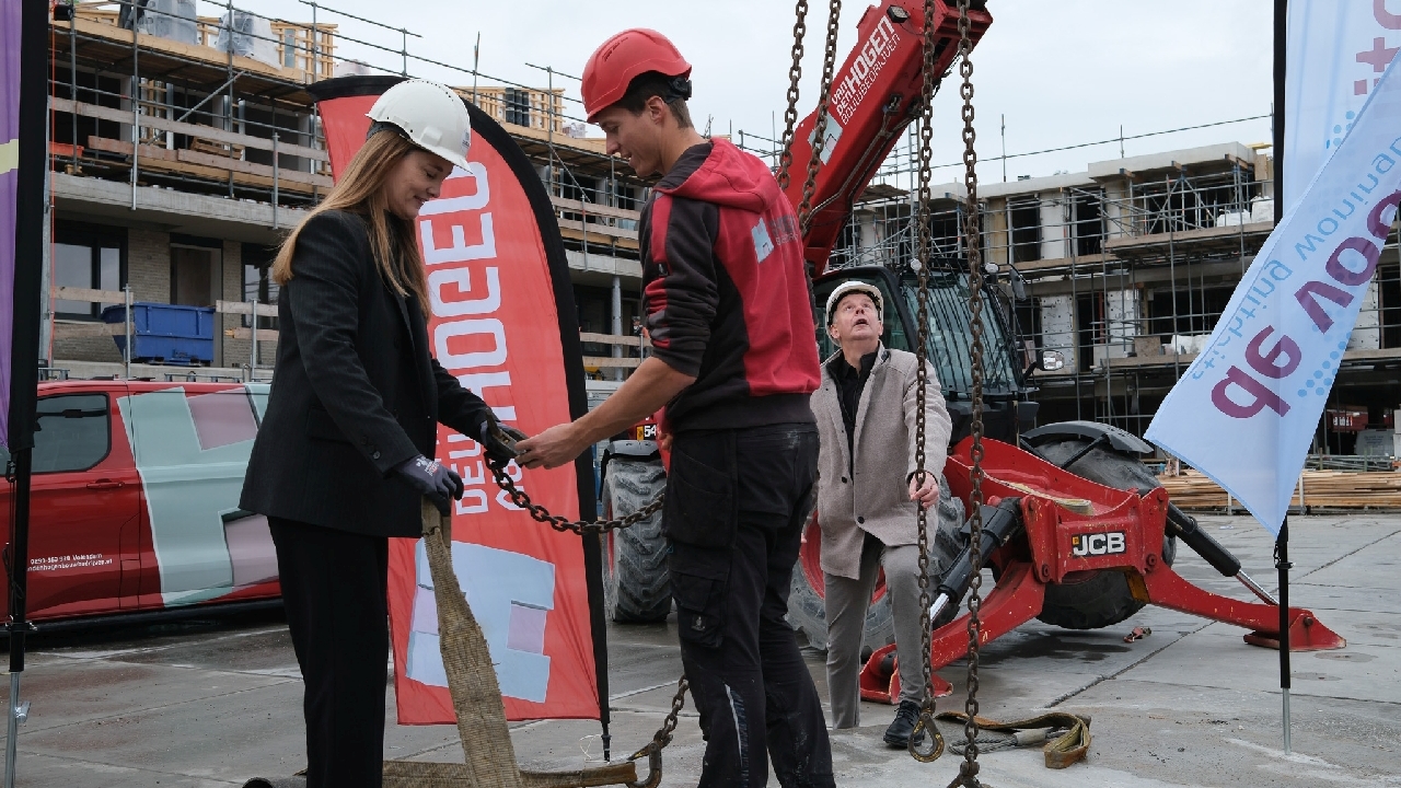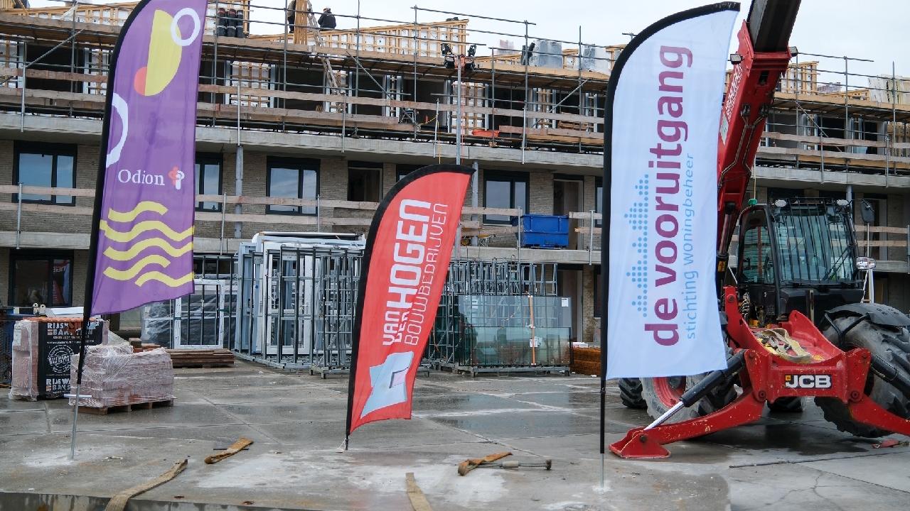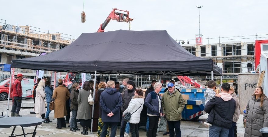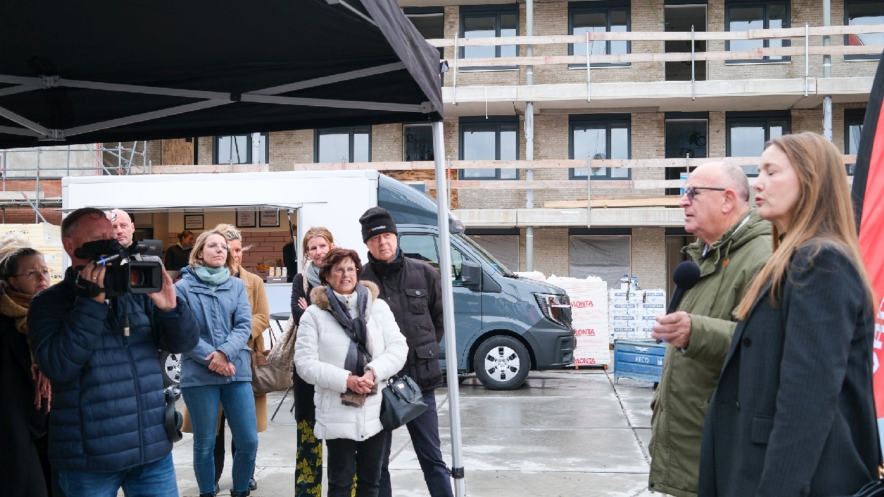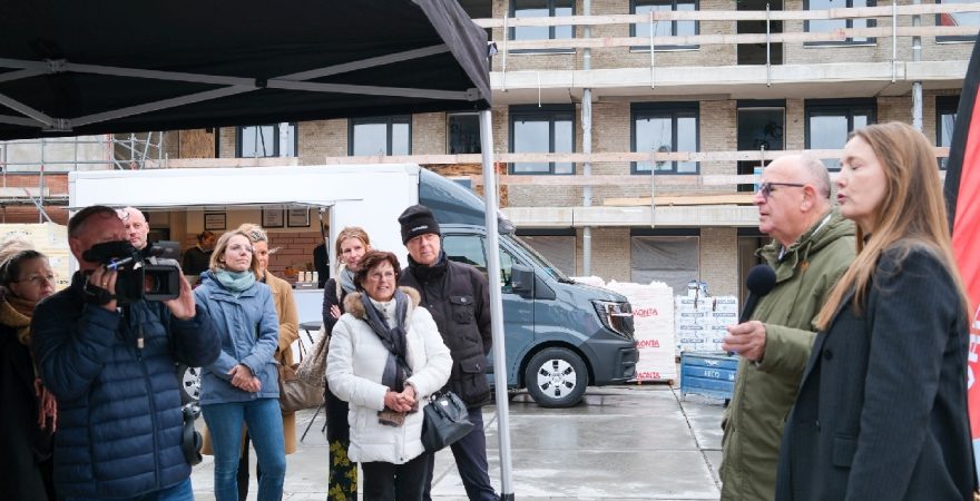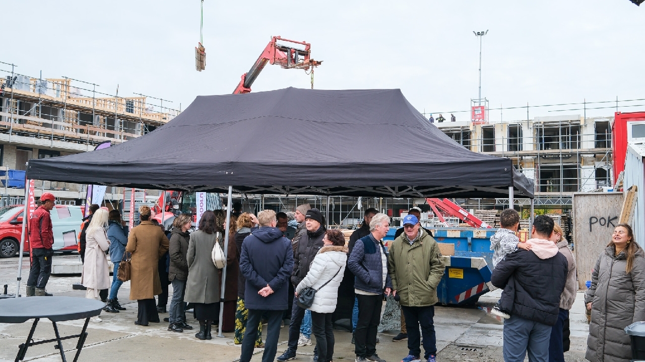 Op de bouwplaats van het nieuwe Maria Goretti-project was het een gezellige drukte. Op het middenterrein verzamelden genodigden van Stichting Woningbeheer De Vooruitgang, vertegenwoordigers van de gemeente, medewerkers van Odion en betrokken aannemers zich voor een bijzonder moment: het bereiken van het hoogste punt van de bouw.