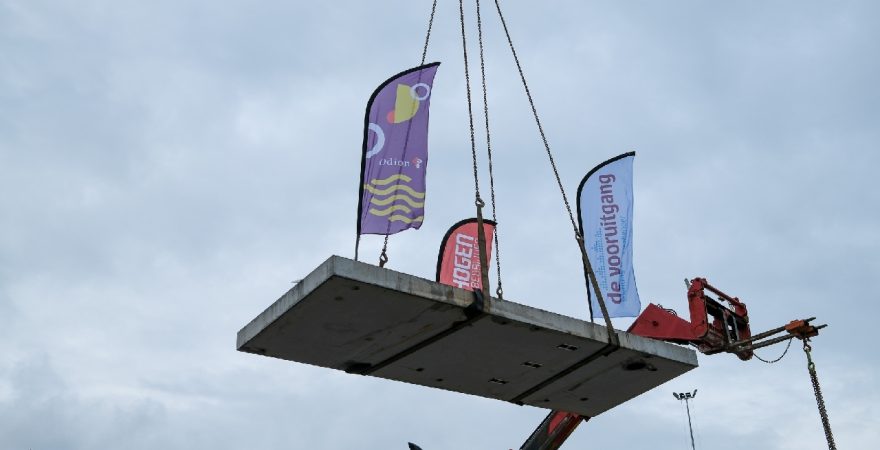 Na een openingswoord door Fred de Boer namens De Vooruitgang, nam Marisa Kes het woord om de aanwezigen toe te spreken. Vervolgens werd een imposante betonnen plaat, voorzien van drie wapperende vlaggen van De Vooruitgang, Odion en Van den Hogen Bouwbedrijven, aan de betonplaat bevestigd. Onder grote belangstelling hees de kraanmachinist van Mick Volendam het gevaarte behoedzaam naar het hoogste punt van de nieuwe woningen.
