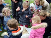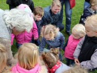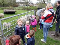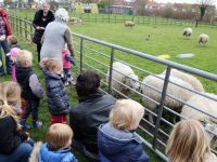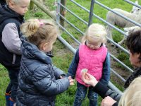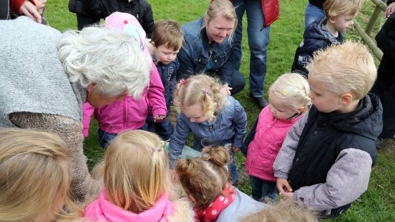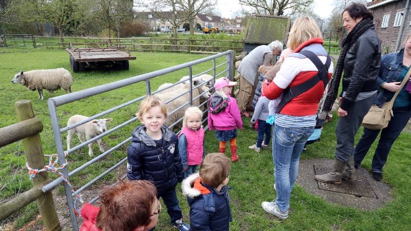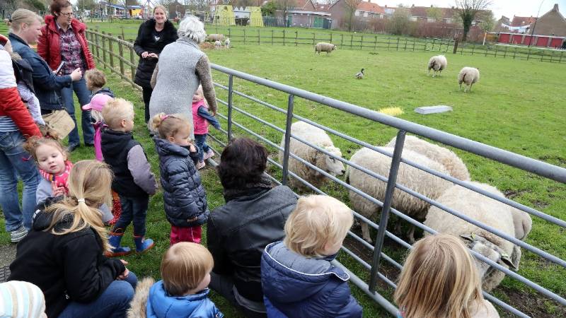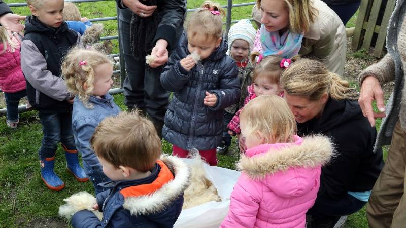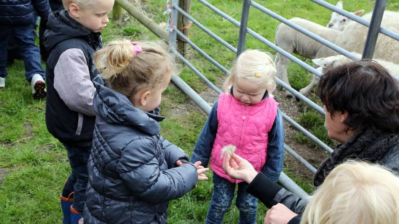 De kleuters mogen er de schapen en lammetjes aaien die rondom de boerderij op het weiland lopen. Elly Beets kwam ook met een zak vol met schapenwol aanzetten, en daaraan konden de kinderen voelen. Ze zwaaiden naar de lammetjes die rondhuppelden.