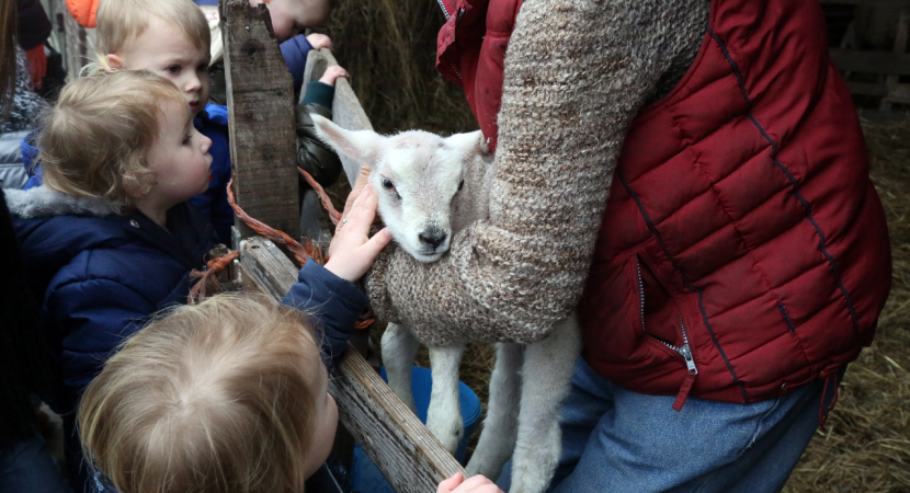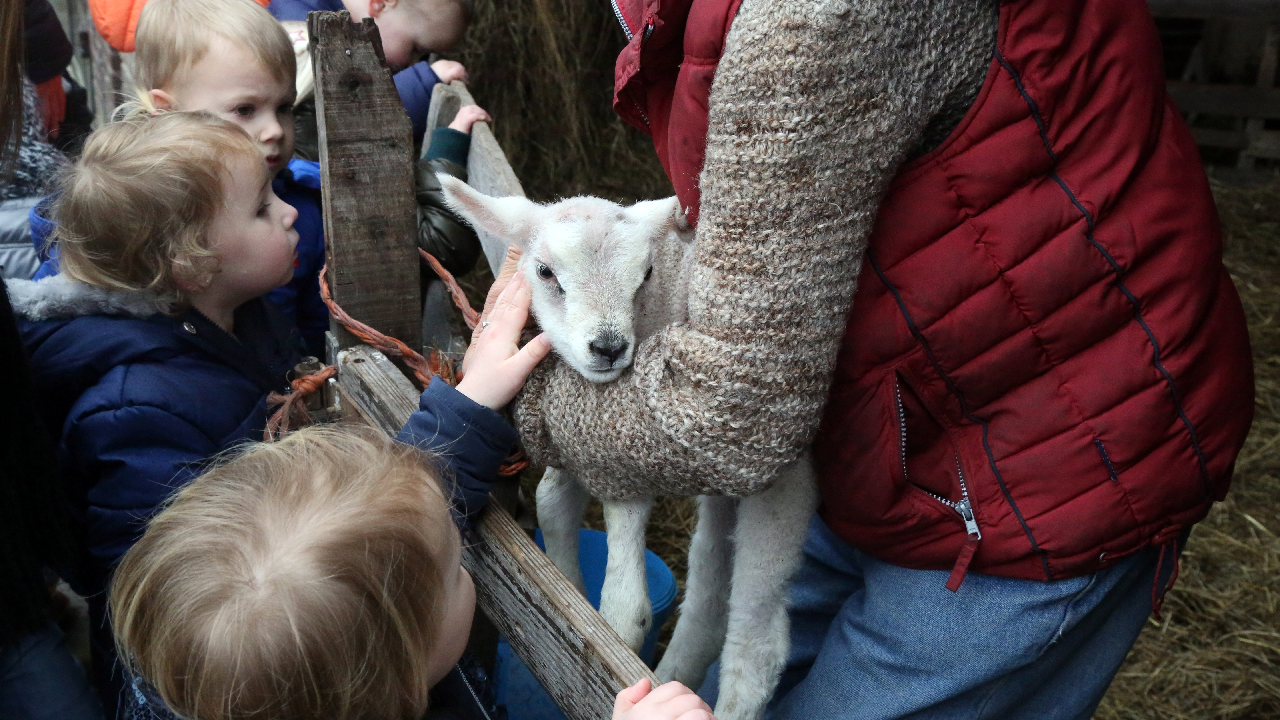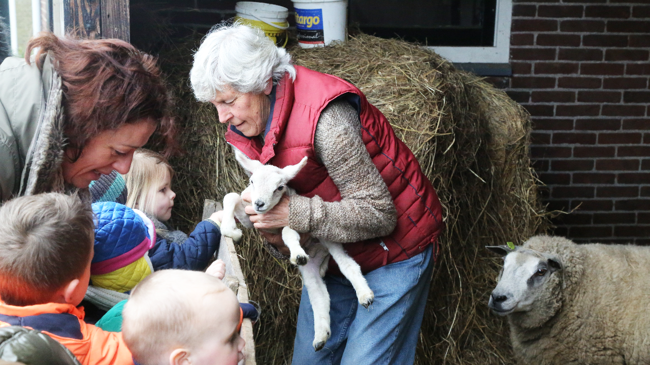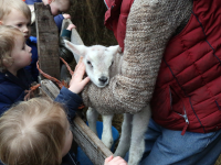 Maandagmorgen kwam de eerste groep kinderen aan bij de boerderij waar ze een gastvrij onthaal kregen van Elly Beets. Zij toonde de kleuters een lammetje en de jongens en meisjes mochten het prille leven even aaien.