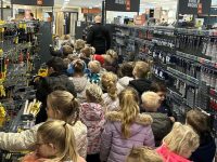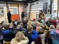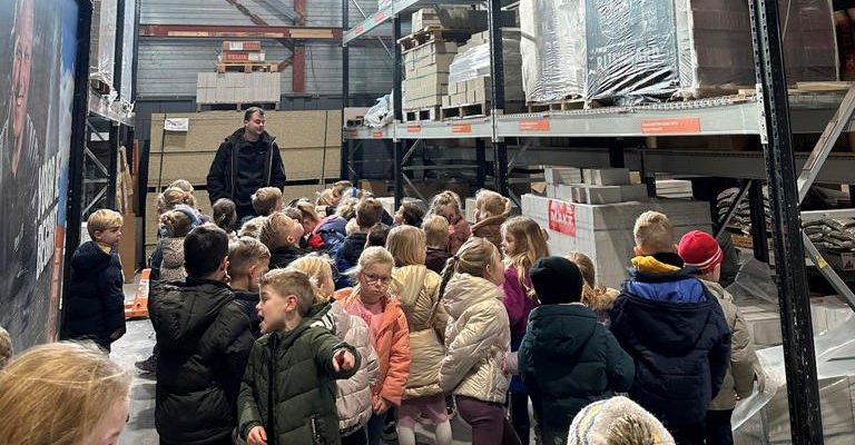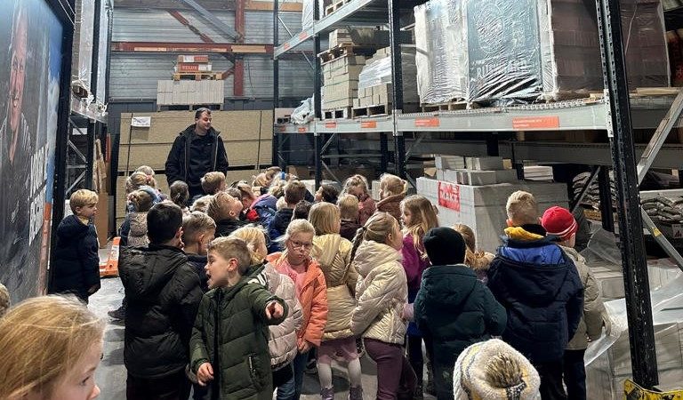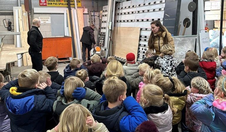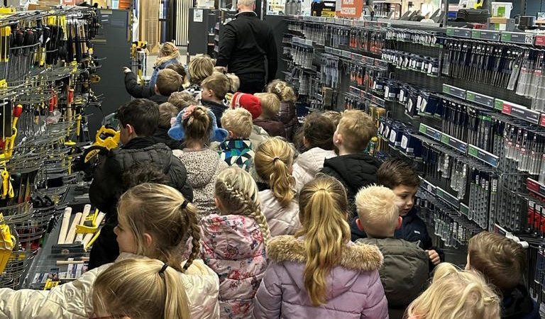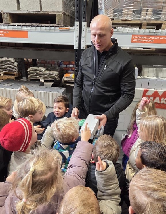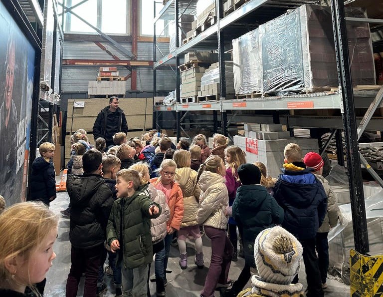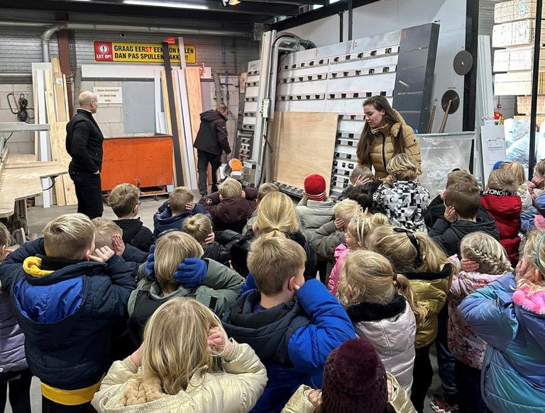 Mede-eigenaar Wim Veerman had er zijn middag voor vrijgemaakt en liet de kinderen kennismaken met materialen, gereedschappen en werkwijzen. In de werkplaats zagen ze stenen, isolatiemateriaal en hout, en werden ter plekke plankjes gezaagd. Als klap op de vuurpijl werd zelfs het schoollogo uitgefreesd.