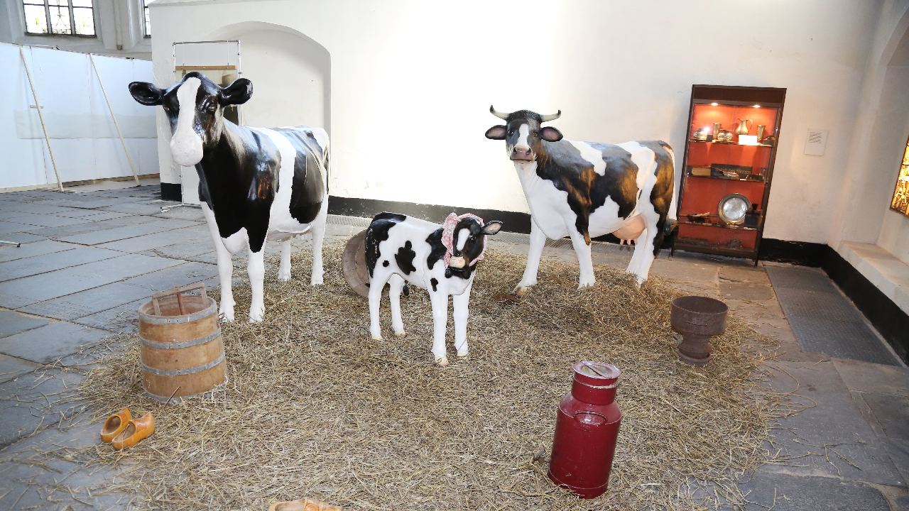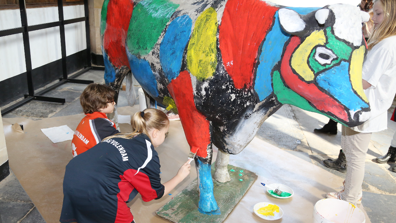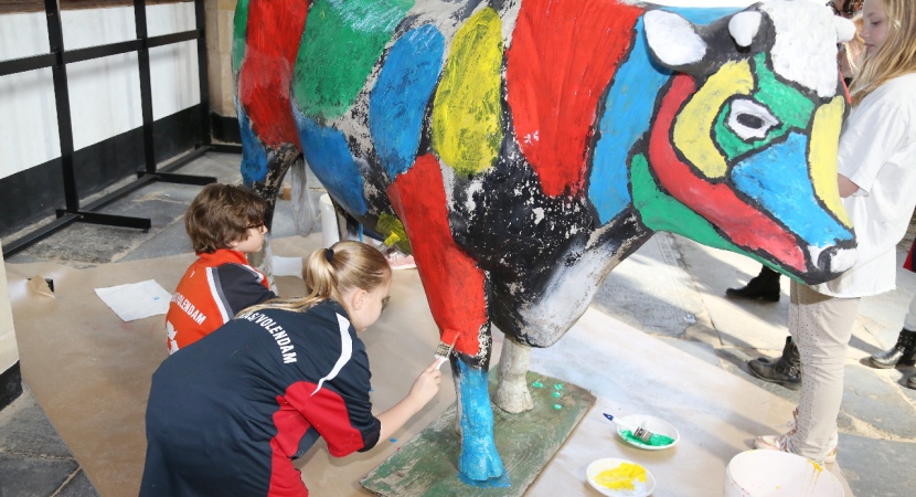 Hier is een expositie over de Watersnoodramp van 1916. In de Grote Kerk staan levensgrote kunststof koeien opgesteld. Eén van die koeien werd door de kinderen beschilderd in Mondriaan-kleuren. Een uur lang waren de meiden met de verfkwast in de weer.