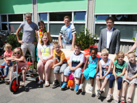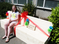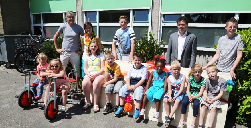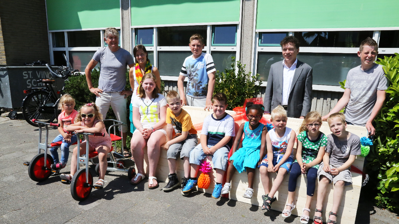 Zo hebben de leerlingen van de Vincentiusschool er een mooie zitbank bij gekregen op het plein, die meteen in gebruik werd genomen.