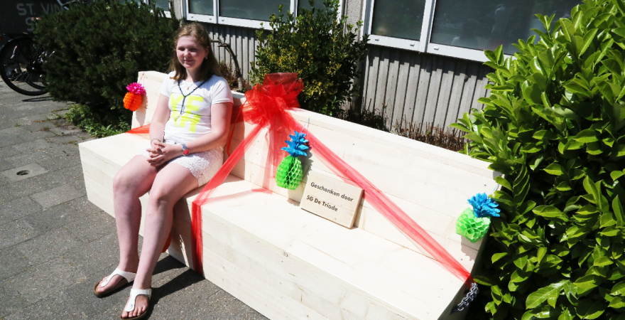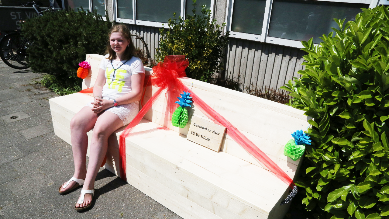 Tijdens een kennismakingsbezoek van basisschoolleerlingen aan S.G. De Triade in Edam, is een slagzinwedstrijd gehouden. Daarbij konden twee loungebanken gewonnen worden voor op het schoolplein.
