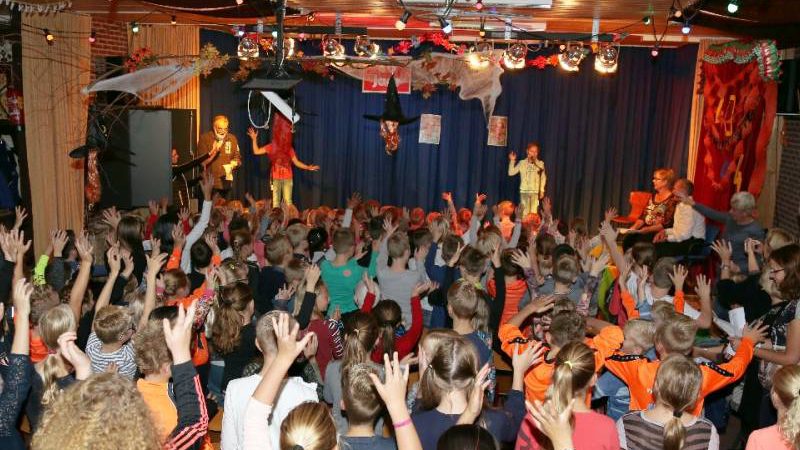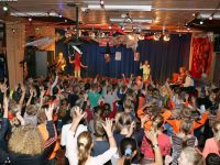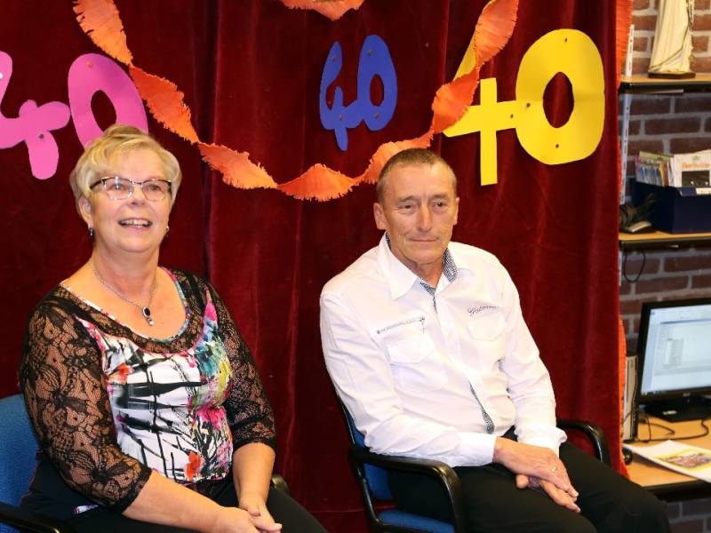 Alle groepen van de Spinmolen zaten bijeen. Nel en Dick van Sinde-ren stonden in het middelpunt van de belangstelling. Directeur Freek Steur hield een toespraakje en door de leerlingen werden liedjes gezongen, voordrachten gedaan en dansjes uitgevoerd.