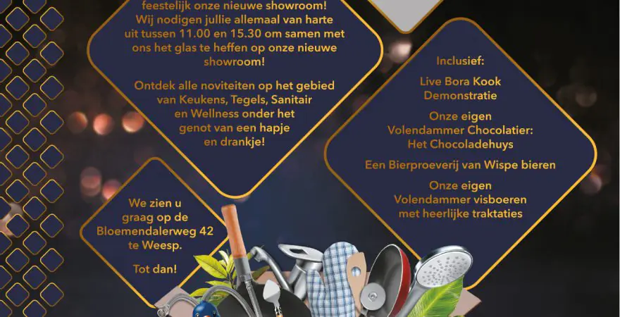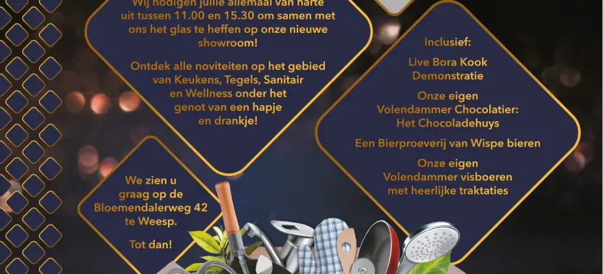 Namens TuijpsHuysch zijn geïnteresseerden op zaterdag 20 januari aanstaande van harte welkom bij de officiële opening van de nieuwe showroom aan de Bloemendalerweg 42 te Weesp. Tussen 11.00 en 15.30 uur kun je het glas heffen op de nieuwe showroom en genieten van heerlijke delicatessen, als vers gefileerde vis, chocolade van Het Chocoladehuys en een bierproeverij van Wispe Brouwerij.