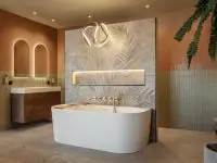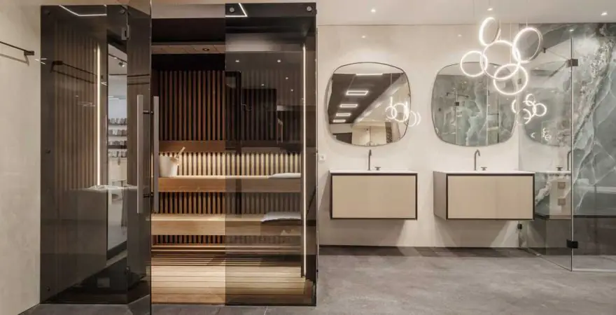 Met 25 opstellingen laat het team van medewerkers en adviseurs, dat elke dag klanten verwelkomt in de showroom, zien wat het bedrijf te bieden heeft. De verschillende opstellingen zijn zorgvuldig uitgekozen, vertelt Pascal Tielemans. „We zetten geen zeven badmeubels naast elkaar om op zoek te gaan naar de verschillen.” De verschillende badkamers en keukens in de showroom hebben stuk voor stuk een eigen sfeer. „Je kunt van dichtbij zien welke sfeer het beste bij jou past, en hoe je het zou willen inrichten. Wordt het bijvoorbeeld warm of juist kouder, grijs of bruin. Je badkamer of keuken is persoonlijk, en we kunnen daarvoor vrijwel elke tegel leveren.”