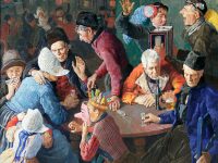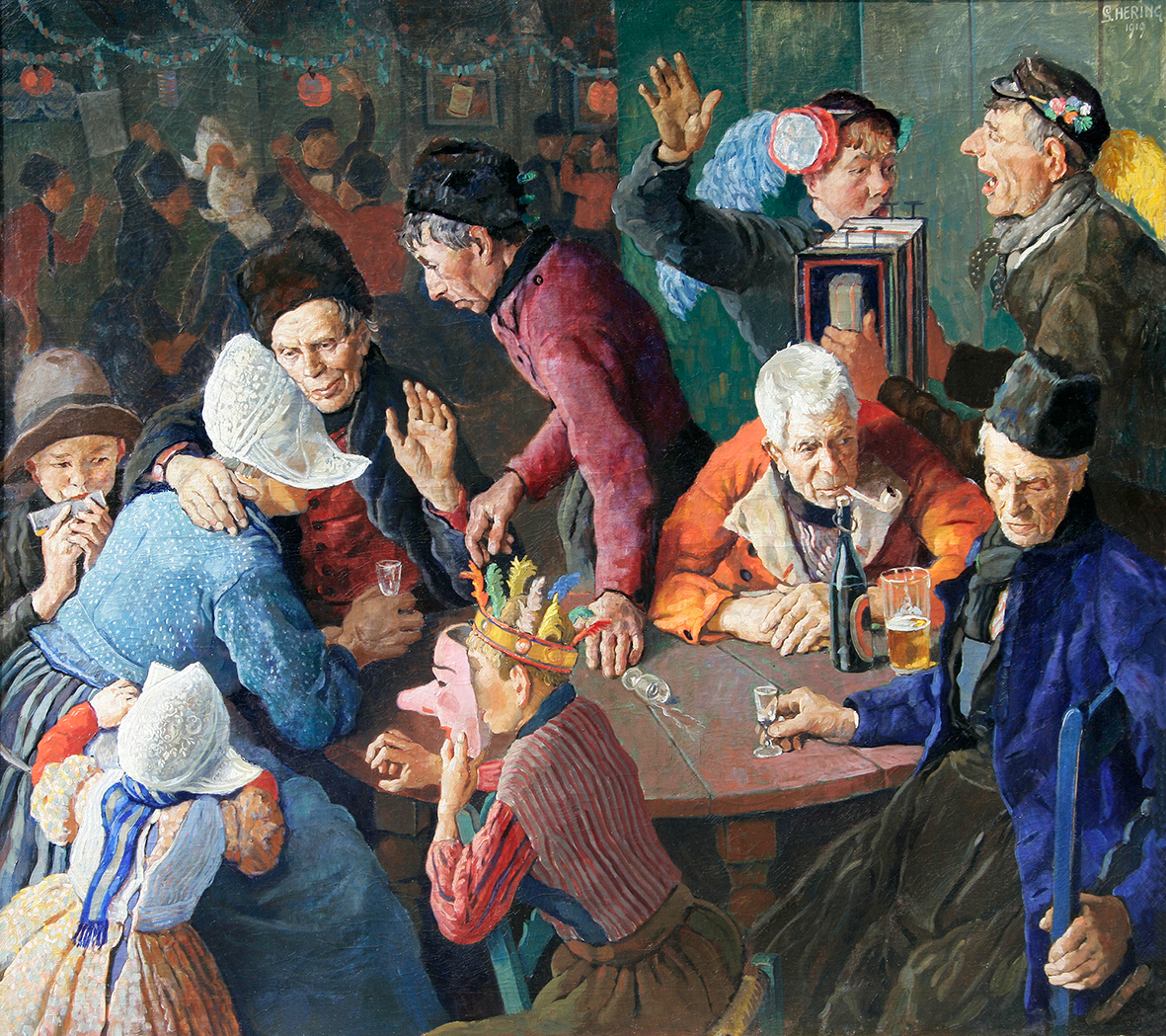 ,,Hering gaf het schilderij de titel ‘Happy Family’. Dat is wrang. Hij maakte het in 1919, een jaar na het overlijden van zijn vrouw Pauline Spaander, eveneens een dochter van Leendert Spaander. Hering bleef achter met zijn dochter Dorothea. Na een tweede huwelijk werd het drama nog groter toen het meisje, vermoedelijk uit jaloezie, door haar stiefmoeder werd gedood. In Volendam leefde men sterk met hem mee. In de wijk ’t 2e Zand is een straat naar de kunstenaar genoemd.”