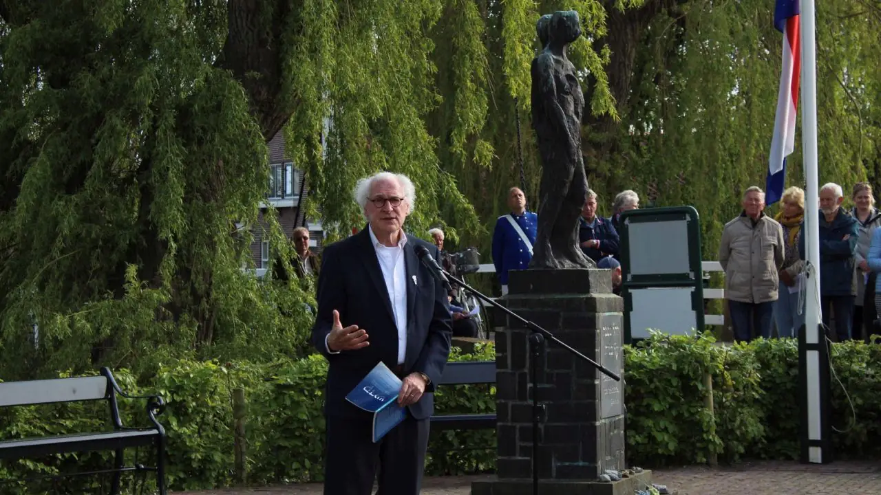 Dodenherdenking in Edam begon op de vroege avond bij ‘De Tochtgenoten’, het Joodse monument langs het Oorgat. Na een indrukwekkende plechtigheid trok het gezelschap in een stille tocht op richting het Egert Snijder Monument.