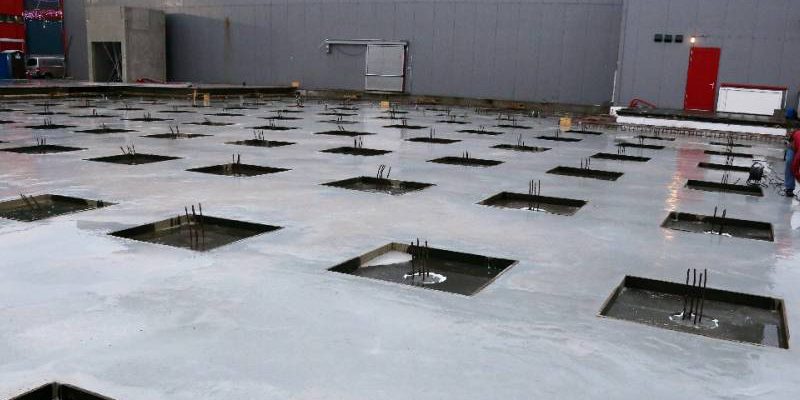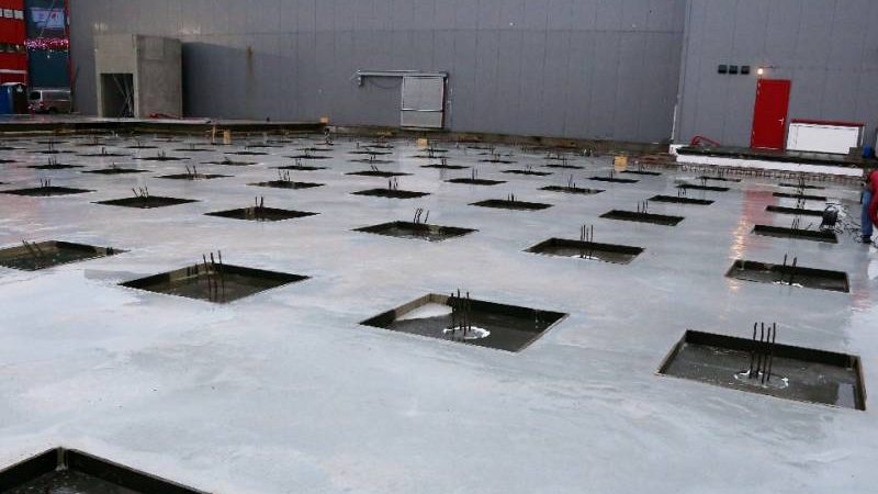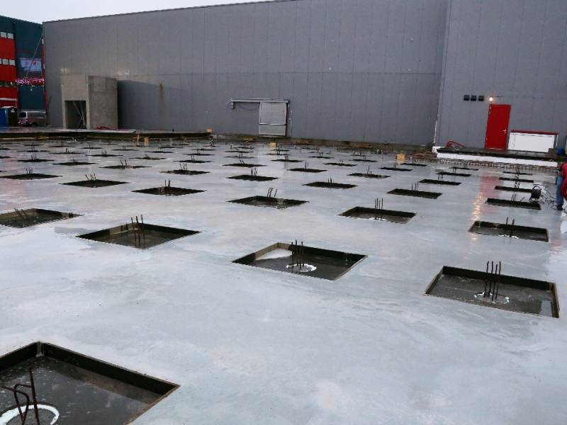 De fundering van de uitbreiding van Mooijer Volendam B.V. aan de Dwarskuul is zo goed als gereed gekomen. Door medewerkers van Loodgietersbedrijf Piet Butter worden de leidingen voor de vloerverwaming momenteel aangelegd.