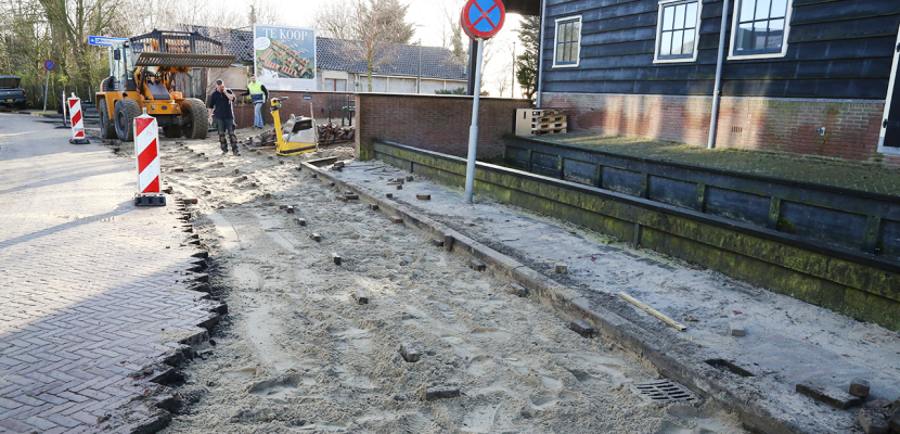 Een week lang is door de stratenmakers van Marco van der Gracht gewerkt aan het ophogen van het parkeerterrein van de donsdekbeddenfabriek van de Gebr. Jonk op het Slobbeland.
