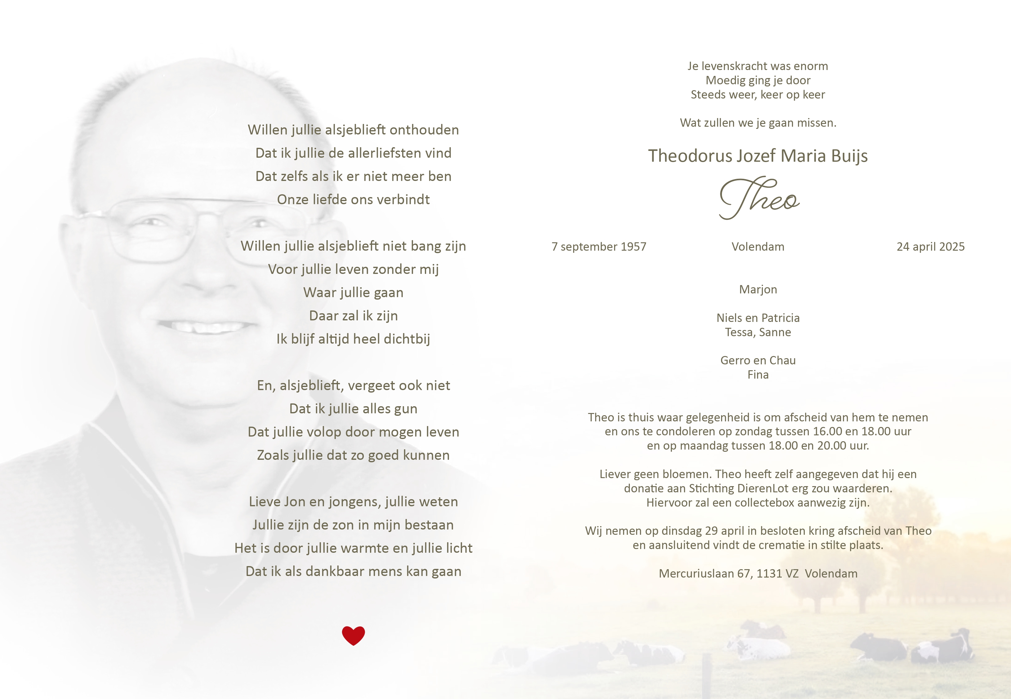 Wij nemen op dinsdag 29 april in besloten kring afscheid van Theo