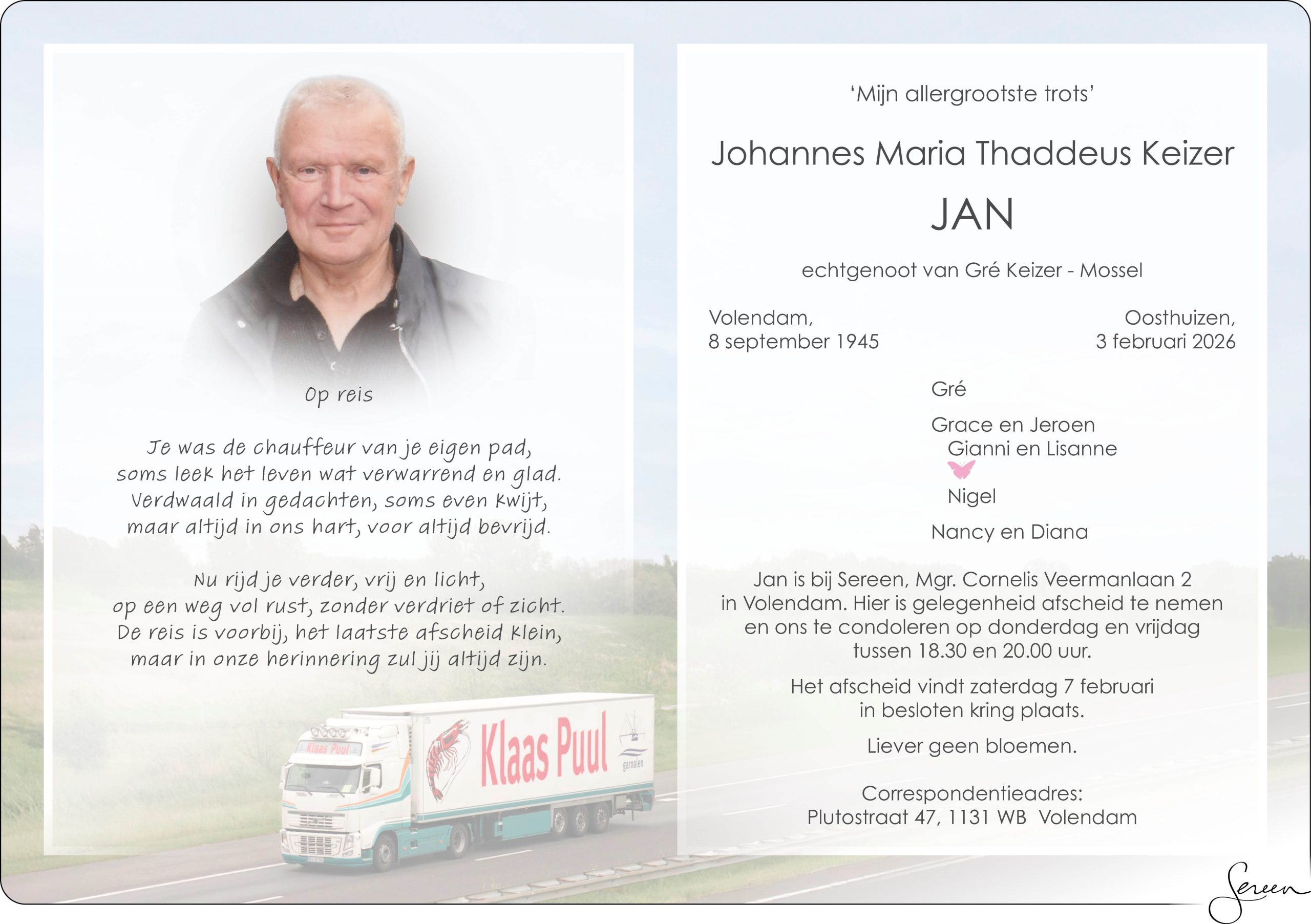 Jan is bij Sereen, Mgr. Cornelis Veermanlaan 2 in Volendam. Hier is gelegenheid afscheid te nemen en ons te condoleren op donderdag en vrijdag tussen 18.30 en 20.00 uur.