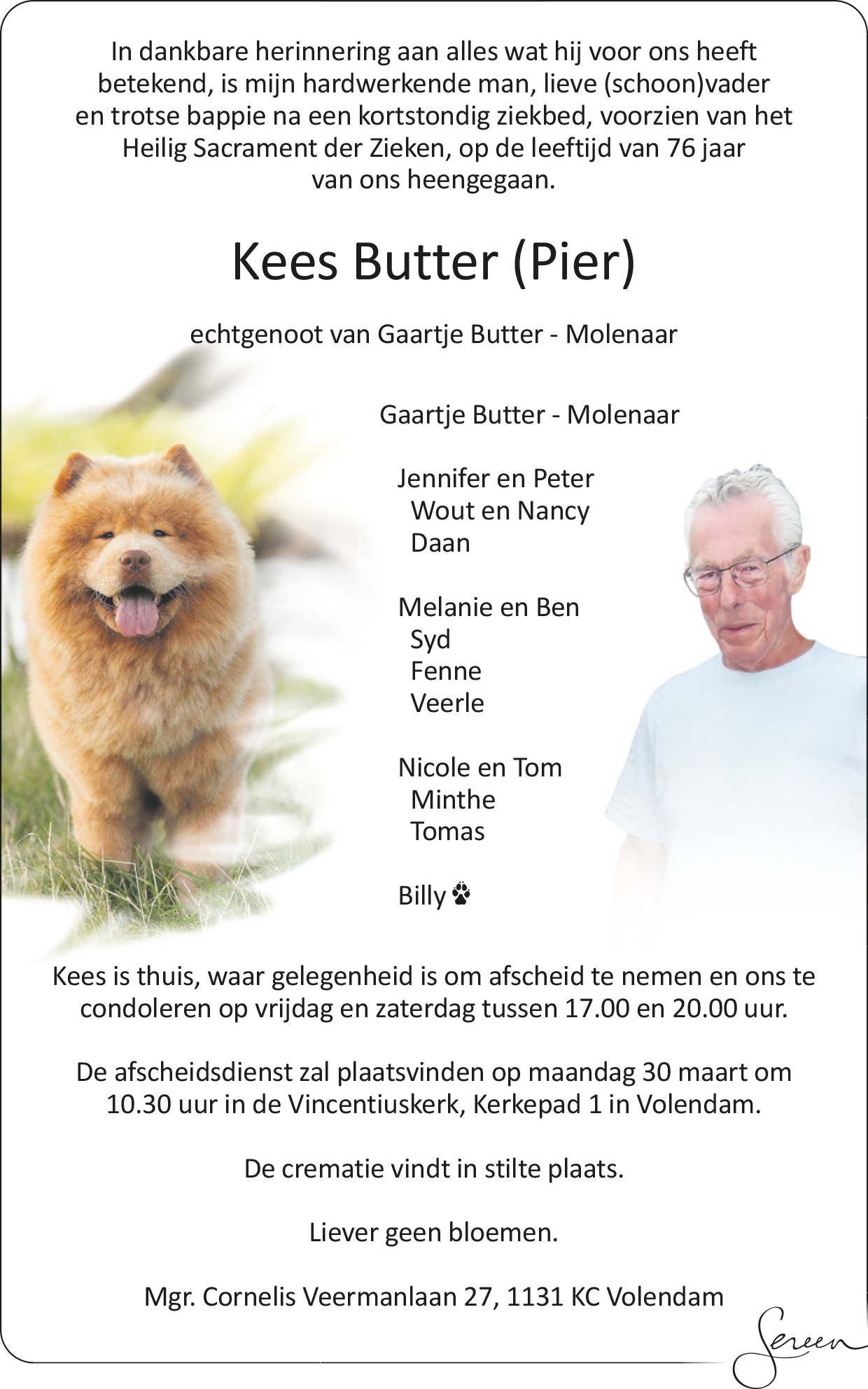 Kees is thuis, waar gelegenheid is om afscheid te nemen en ons te condoleren op vrijdag en zaterdag tussen 17.00 en 20.00 uur.
