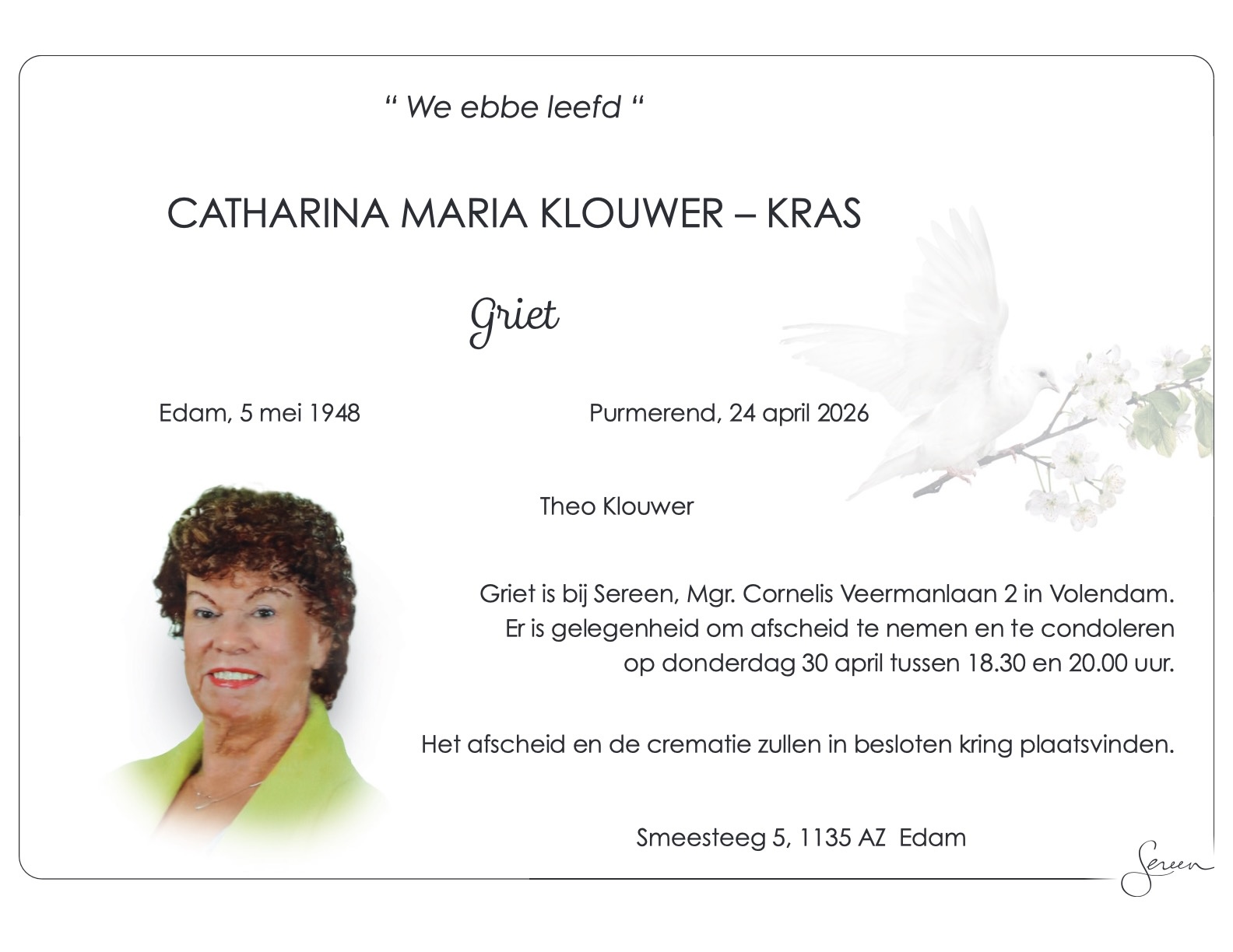 Griet is bij Sereen, waar gelegenheid is om afscheid van haar te nemen en Theo te condoleren op donderdag 30 april tussen 18.30 en 20.00 uur.