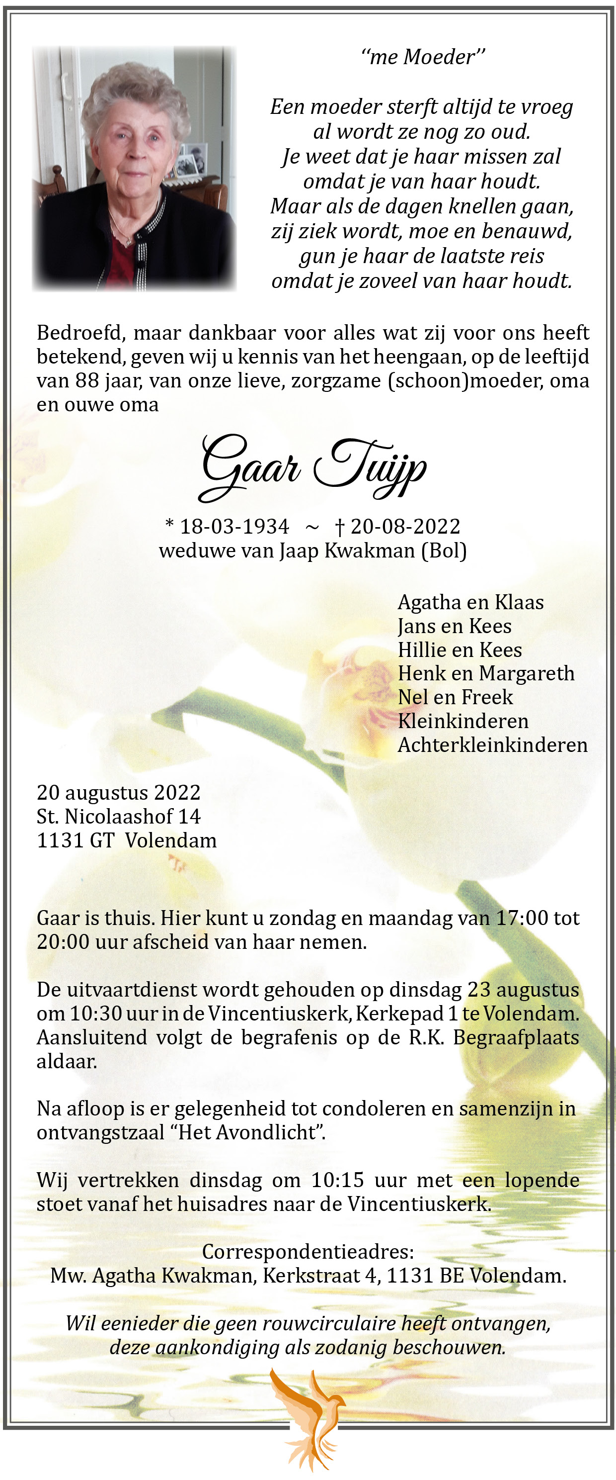 De uitvaartdienst wordt gehouden op dinsdag 23 augustus om 10:30 uur in de Vincentiuskerk, Kerkepad 1 te Volendam. Aansluitend volgt de begrafenis op de R.K. Begraafplaats aldaar.